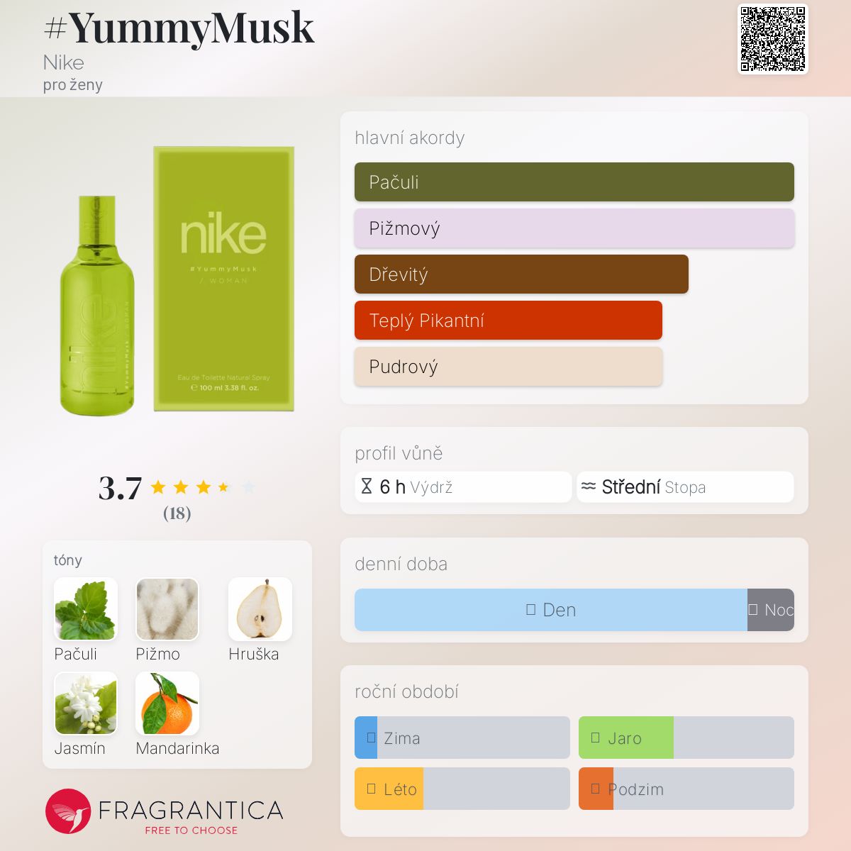 #YummyMusk podle Nike je Floral Fruity vůně pro ženy. Toto je nová vůně. #YummyMusk byl/a uveden/a v roce 2024. Vrchní tóny jsou Hruška a Mandarinka; střední tón jeJasmín ; základní tóny jsou Pačuli a Pižmo.