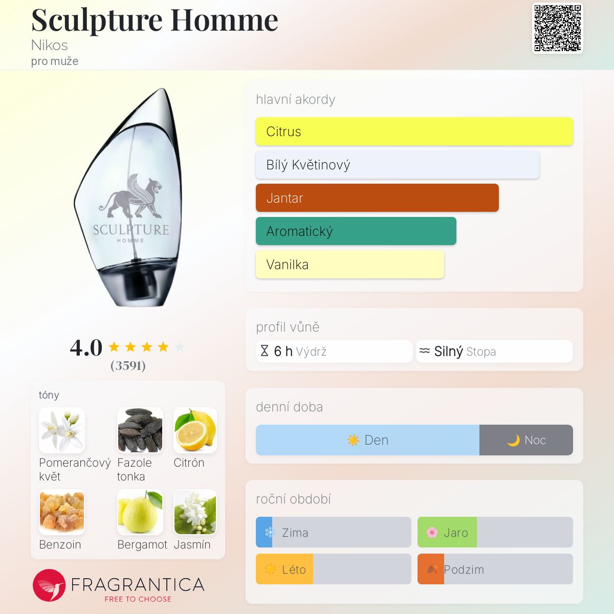 Sculpture Homme podle Nikos je Orientální Fougere vůně pro muže. Sculpture Homme byl/a uveden/a v roce 1995. "Nosem" za touto vůní je Michel Almairac. Vrchní tóny jsou Pomerančový květ, Citrón, Bergamot a Mandarinka; střední tóny jsouJasmín, Konvalinka, Pelargónie a Růže ; základní tóny jsou Fazole tonka, Benzoin, Jantar (ambra) a Cedr.