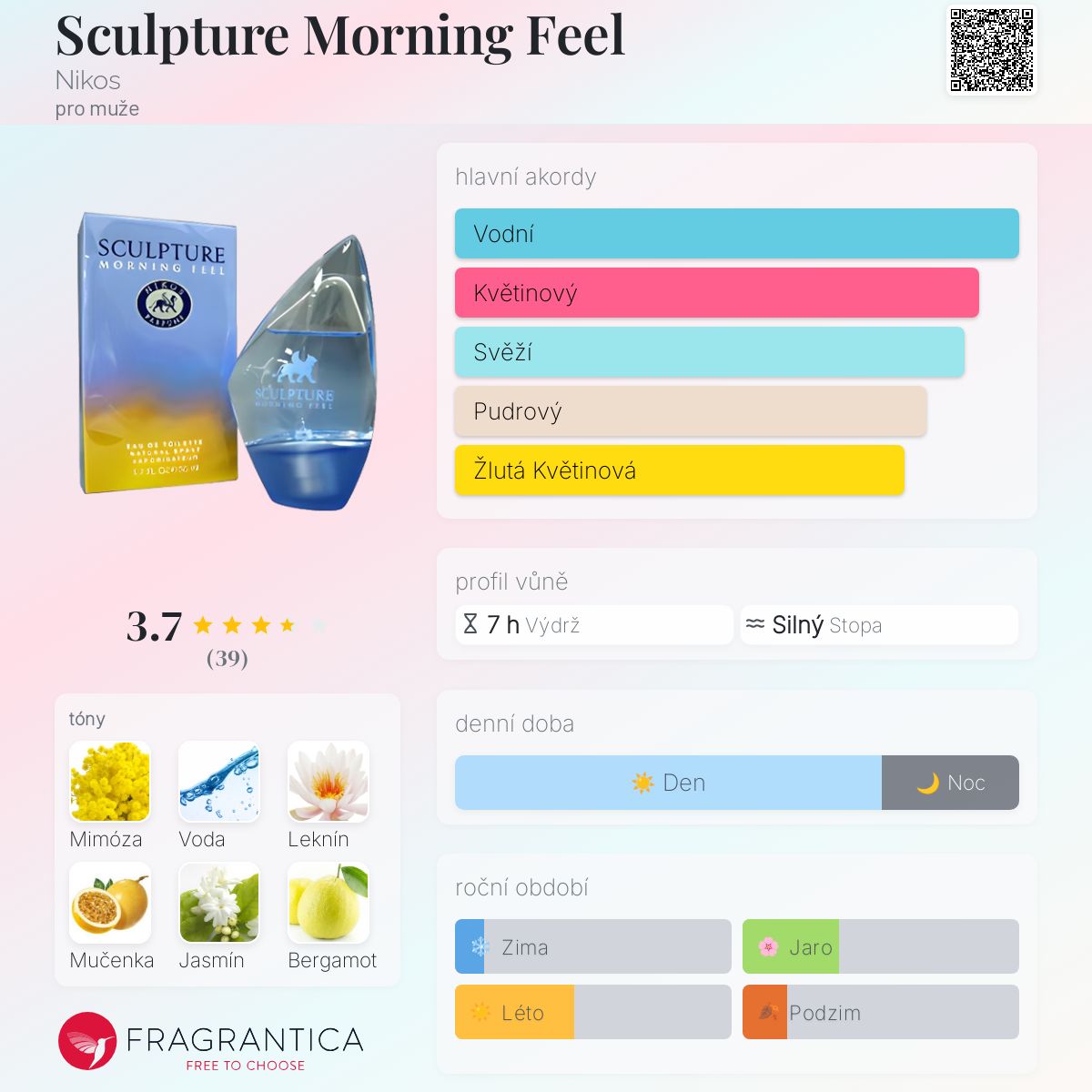 Sculpture Morning Feel podle Nikos je Woody Floral Musk vůně pro muže. Sculpture Morning Feel byl/a uveden/a v roce 2007. Vrchní tóny jsou Vodní tóny, Mučenka a Bergamot; střední tóny jsouMimóza, Leknín a Jasmín ; základní tóny jsou Santalové dřevo, Pižmo a Jantar (ambra).