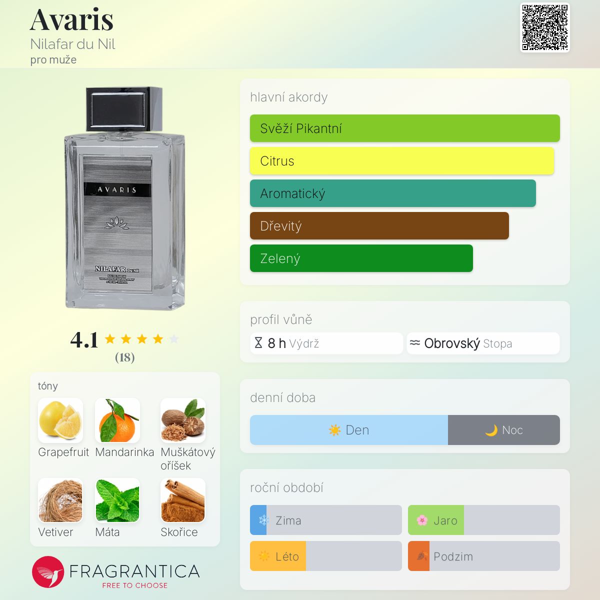 Avaris podle Nilafar du Nil je Woody Spicy vůně pro muže. Avaris byl/a uveden/a v roce 2020. Vrchní tóny jsou Grapefruit, Mandarinka, Máta a Skořice; střední tóny jsouMuškátový oříšek, Levandule, Pelargónie a Hedione ; základní tóny jsou Vetiver, Cedr, Ambroxan, Kašmír a Pačuli.