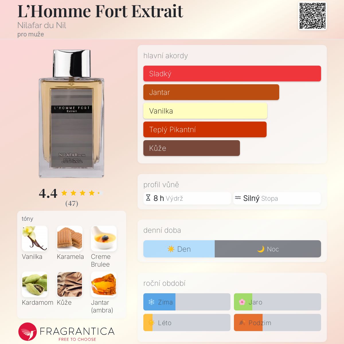 L’Homme Fort Extrait podle Nilafar du Nil je Orientální vůně pro muže. L’Homme Fort Extrait byl/a uveden/a v roce 2021. Vrchní tóny jsou Creme Brulee, Sladké tóny, Myrha a Ananas; střední tóny jsouVanilka, Karamela a Skořice ; základní tóny jsou Kardamom, Kůže, Jantar (ambra), Fazole tonka, Ambroxan a Pačuli.