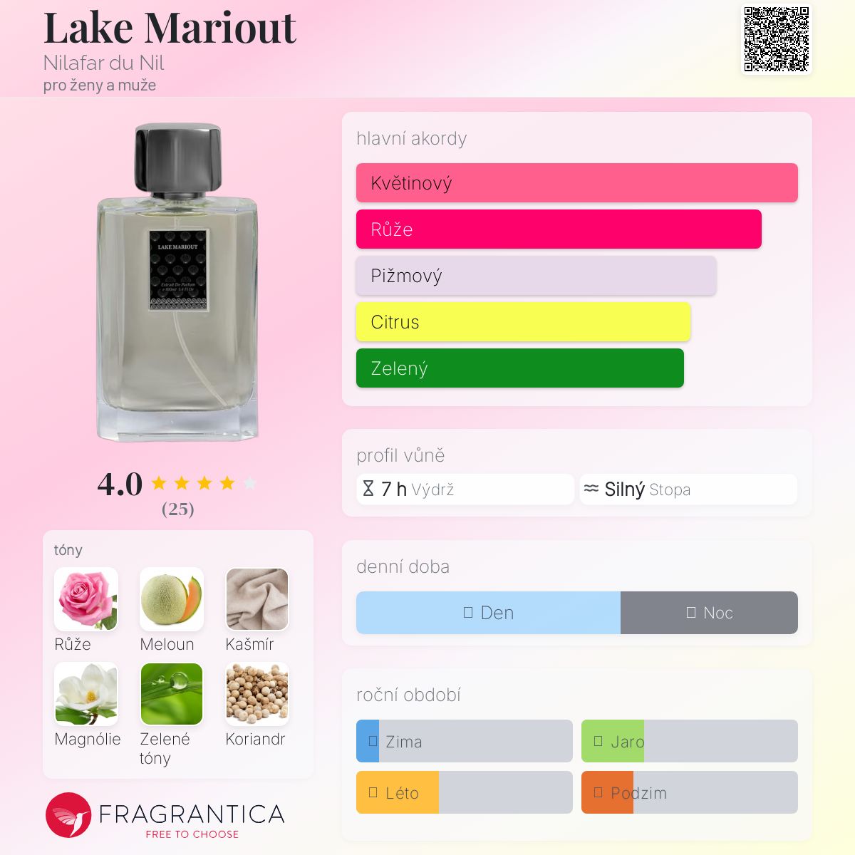 Lake Mariout podle Nilafar du Nil je Citrus vůně pro ženy a muže. Lake Mariout byl/a uveden/a v roce 2023. "Nosem" za touto vůní je Arnaud Fourré. Vrchní tóny jsou Koriandr a Yuzu; střední tóny jsouRůže, Meloun, Magnólie a Zelené tóny ; základní tóny jsou Kašmír a Ambrette (přírodní pižmo).