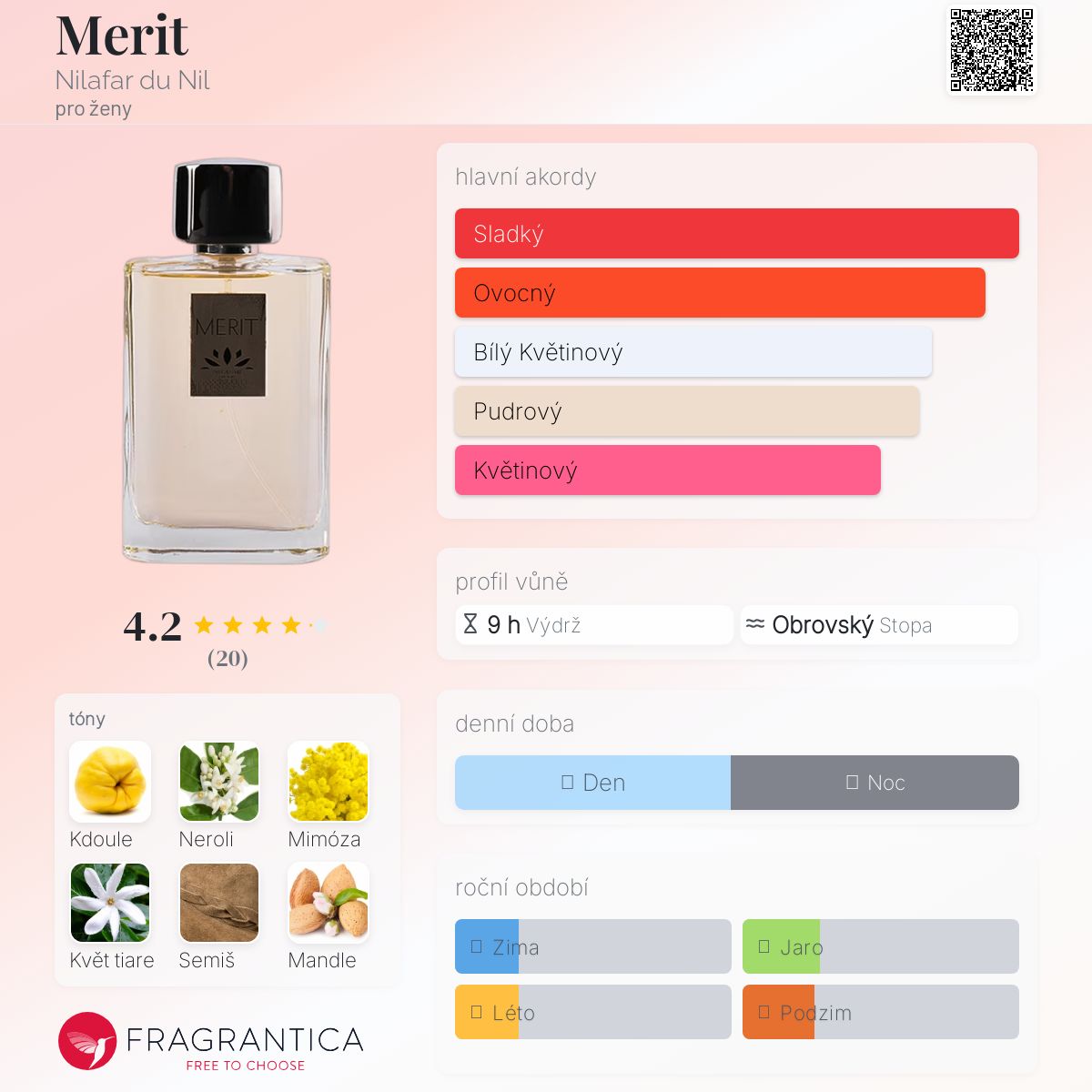 Merit podle Nilafar du Nil je Chypre Floral vůně pro ženy. Merit byl/a uveden/a v roce 2022. "Nosem" za touto vůní je AbdelFattah Nassar. Vrchní tóny jsou Kdoule, Neroli, Mandle, Tabákový list a Kokos; střední tóny jsouMimóza, Květ tiare, Semiš, Maté, Pačuli, Švestka, Elimi a Balzám Tolu ; základní tóny jsou Fialkový list, Cedr, Pižmo, Vanilka a Dubový mech.