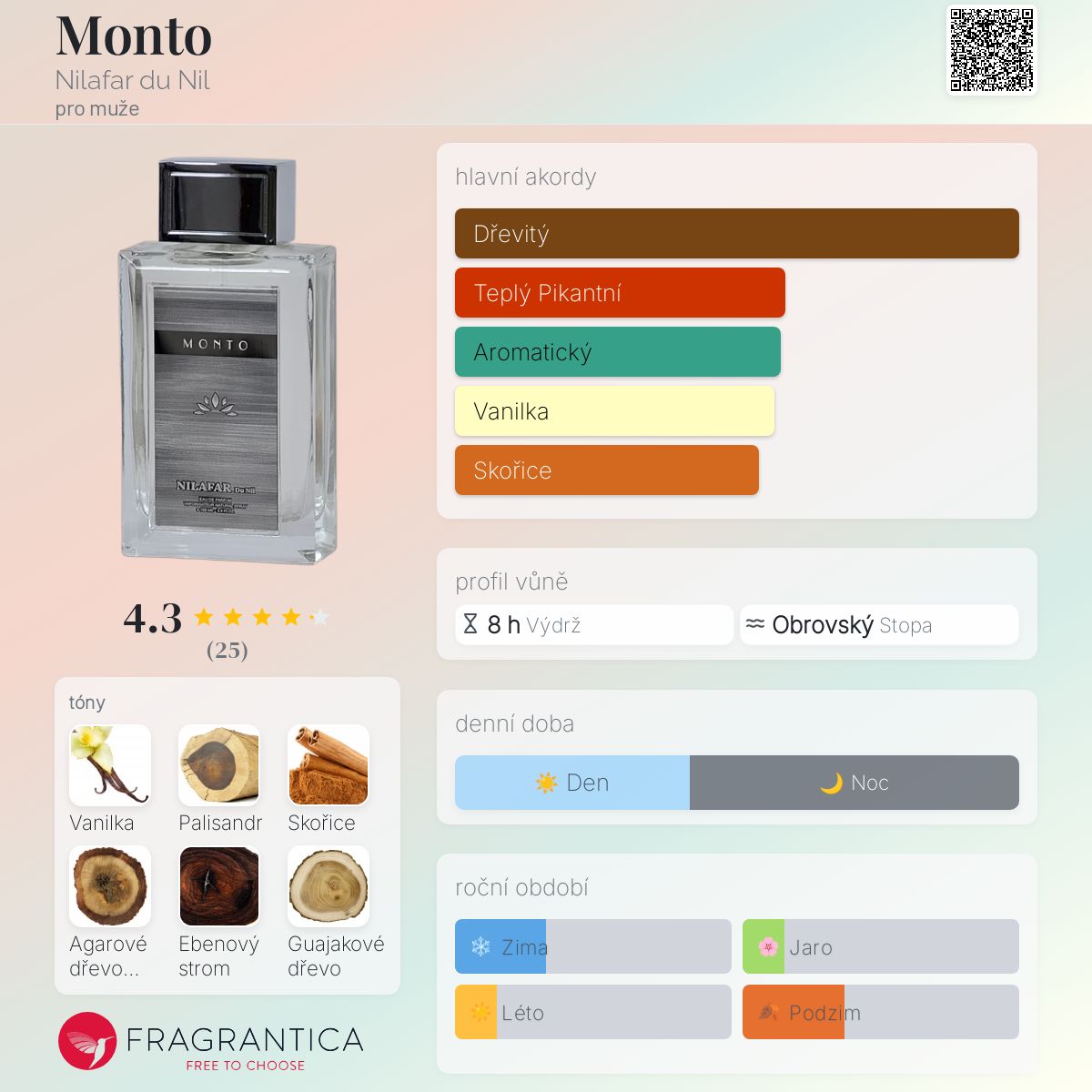 Monto podle Nilafar du Nil je Orientální Woody vůně pro muže. Monto byl/a uveden/a v roce 2020. Vrchní tóny jsou Vanilka, Palisandr, Skořice a Agarové dřevo (oud); střední tóny jsouVanilka, Pryskyřice elemi a Jasmín ; základní tóny jsou Vanilka, Ebenové dřevo, Guajakové dřevo, Cedr a Vetiver.