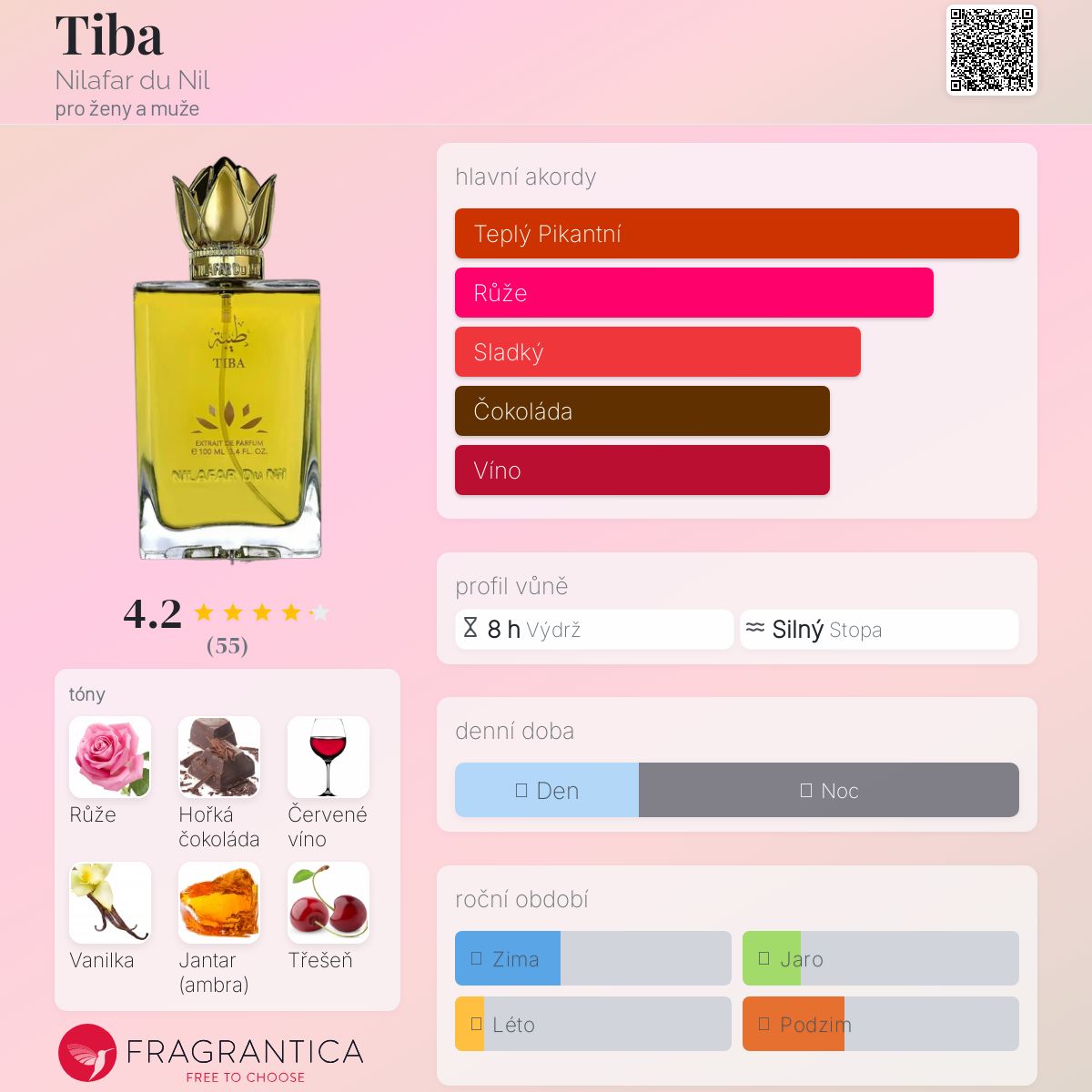 Tiba podle Nilafar du Nil je Orientální Floral vůně pro ženy a muže. Tiba byl/a uveden/a v roce 2022. "Nosem" za touto vůní je Chris Maurice. Vrchní tóny jsou Damašská růže, Hřebíček, Muškátový oříšek, Šafrán, Neroli, Rozinka, Citrón a Lipový květ; střední tóny jsouTurecká růže, Růže, Hořká čokoláda, Červené víno, Třešeň, Kakao, Bourbonská whisky, Jamajský pepř a Kardamom ; základní tóny jsou Vanilka, Jantar (ambra), Santalové dřevo, Semiš, Dub, Tabák a Pižmo.