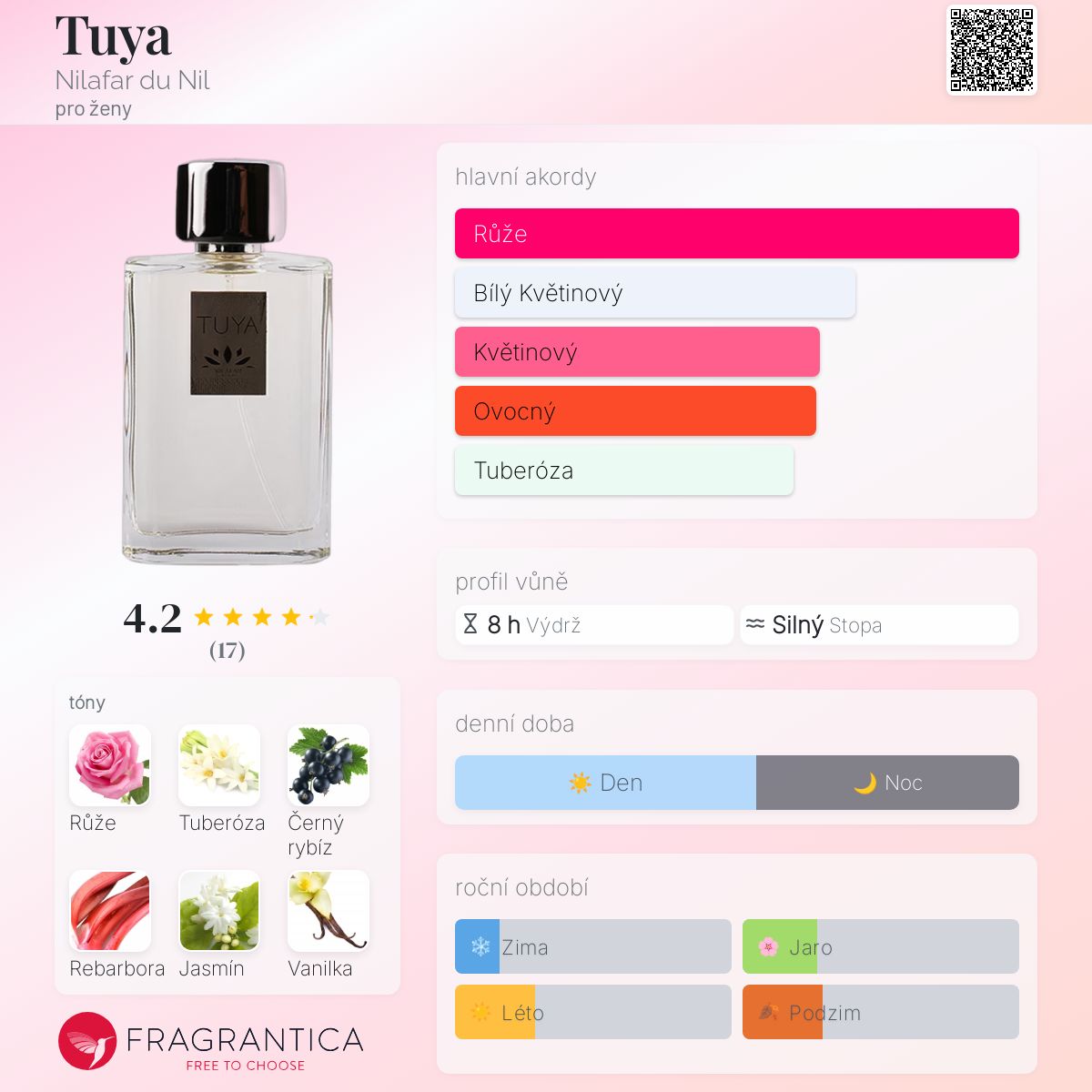 Tuya podle Nilafar du Nil je Orientální Floral vůně pro ženy. Tuya byl/a uveden/a v roce 2022. Vrchní tóny jsou Černý rybíz a Rebarbora; střední tóny jsouRůže, Jasmín, Ylang-Ylang a Plumérie ; základní tóny jsou Tuberóza, Vanilka, Pižmo, Pačuli a Santalové dřevo.
