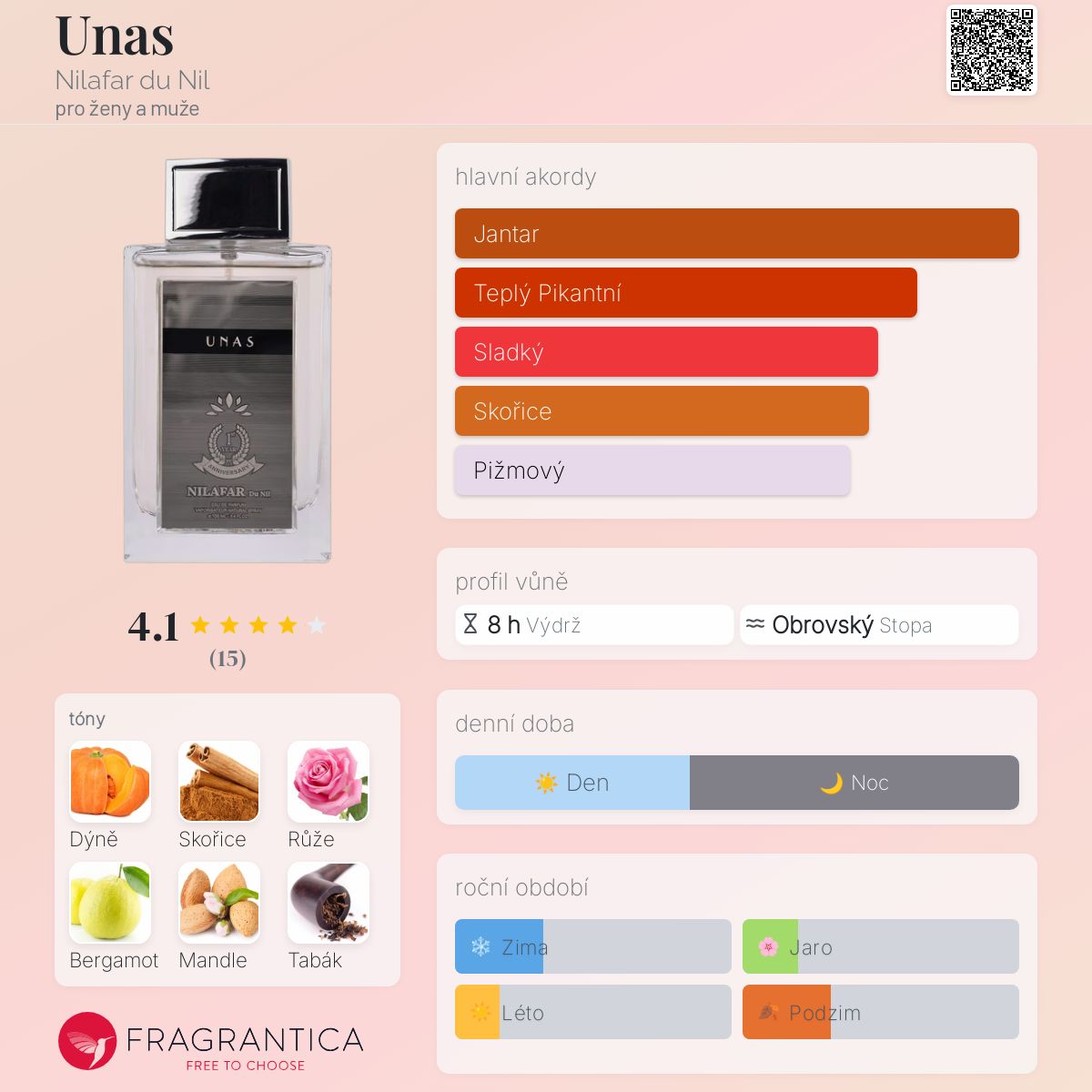 Unas podle Nilafar du Nil je Orientální vůně pro ženy a muže. Unas byl/a uveden/a v roce 2021. Vrchní tóny jsou Skořice, Růže a Bergamot; střední tóny jsouDýně, Mandle, Tabák a Muškátový oříšek ; základní tóny jsou Styrax, Benzoin, Jantar (ambra), Semiš, Pižmo a Pačuli.