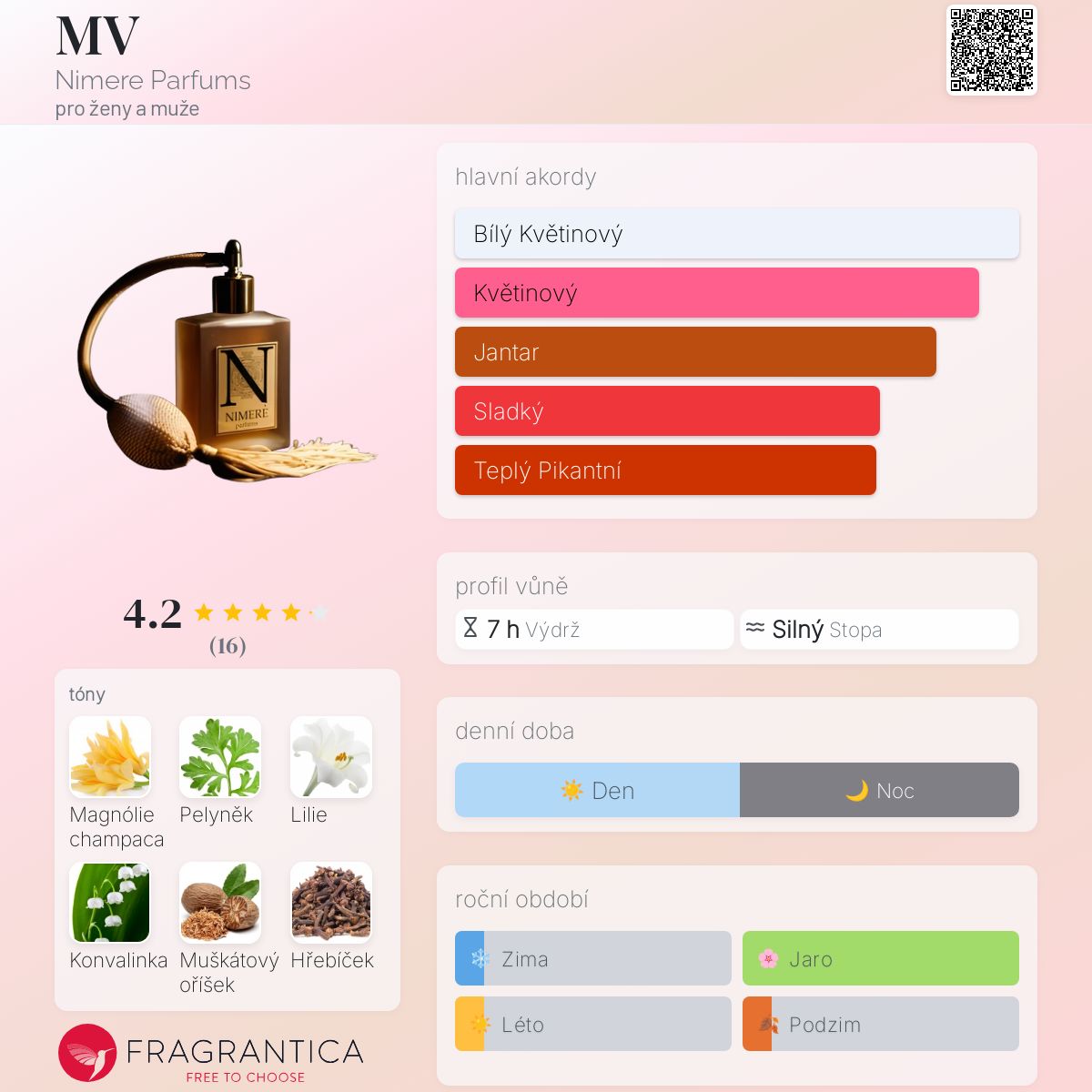 MV podle Nimere Parfums je Floral vůně pro ženy a muže. MV byl/a uveden/a v roce 2015. MV byl/a vytvořen/a Nikolay Eremin a Megan Virtanen. Vrchní tóny jsou Pelyněk, Růžový pepř a Bergamot; střední tóny jsouLilie, Konvalinka, Ylang-Ylang, Jasmín, Neroli, Orchidej, Alžírská pelargonie a Hortensie ; základní tóny jsou Magnólie champaca, Muškátový oříšek, Hřebíček, Pižmo, Jasmín, Labdanum, Myrha, Peruánský balzám, Dubový mech, Benzoin, Skořice, Fazole tonka, Guajakové dřevo, Tuberóza, Cedr, Vetiver a Pačuli.