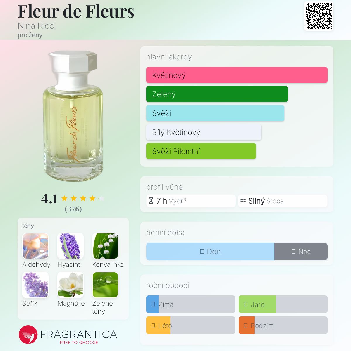 Fleur de Fleurs podle Nina Ricci je Floral Aldehyde vůně pro ženy. Fleur de Fleurs byl/a uveden/a v roce 1982. "Nosem" za touto vůní je Betty Busse. Vrchní tóny jsou Aldehydy, Zelené tóny, Bergamot a Citrón; střední tóny jsouHyacint, Konvalinka, Šeřík, Magnólie, Brambořík, Kosatec, Ylang-Ylang, Jasmín a Rozmarýn ; základní tóny jsou Cibetka, Santalové dřevo a Pižmo.