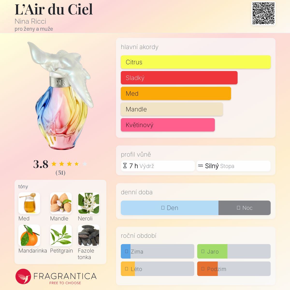 L’Air du Ciel podle Nina Ricci je Floral Fruity Gourmand vůně pro ženy a muže. L’Air du Ciel byl/a uveden/a v roce 2019. L’Air du Ciel byl/a vytvořen/a Natalie Gracia-Cetto a Louise Turner. Vrchní tóny jsou Mandarinka, Petitgrain a Bergamot; střední tón jeNeroli ; základní tóny jsou Med, Hořká mandle, Fazole tonka a Bílé pižmo.