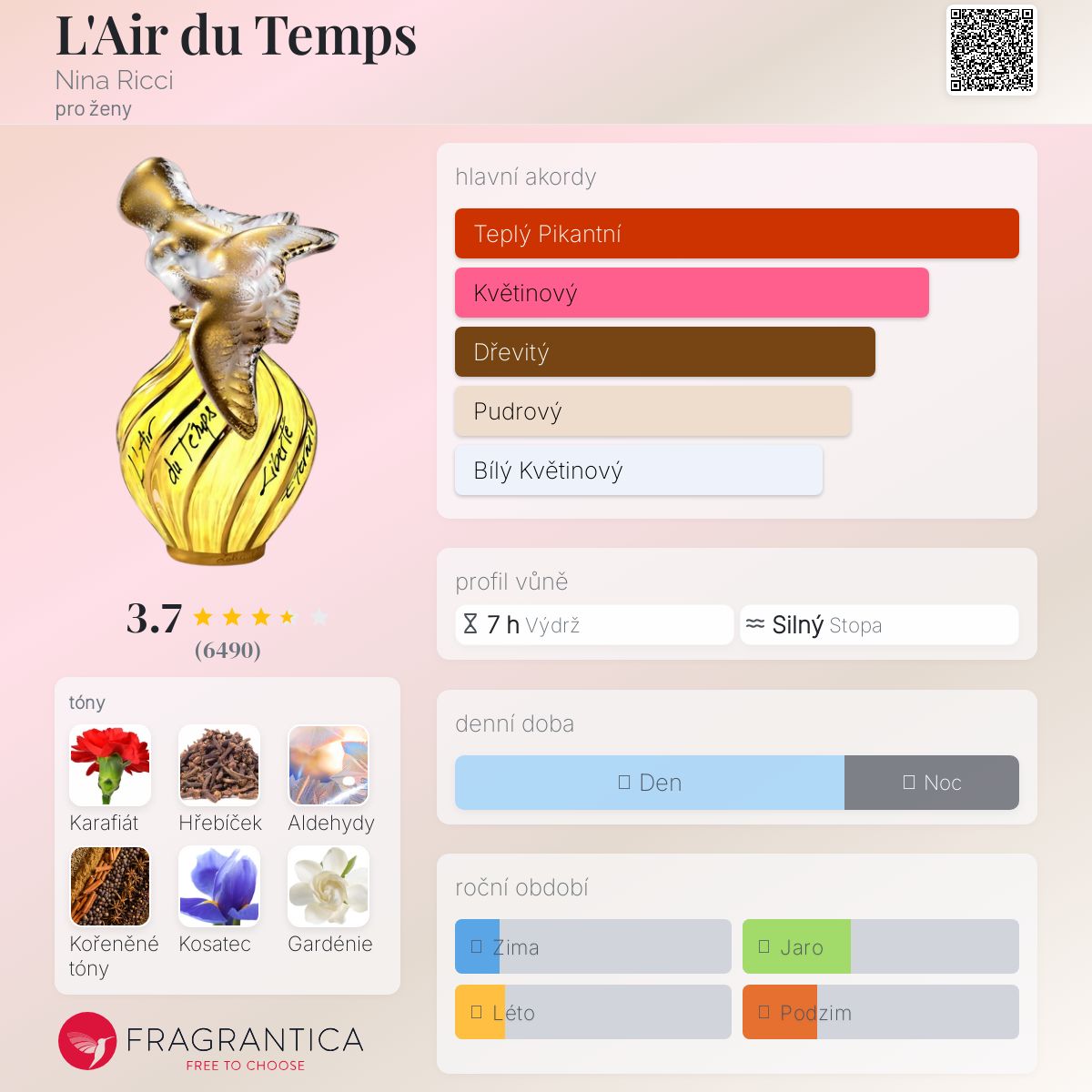 L'Air du Temps podle Nina Ricci je Floral vůně pro ženy. L'Air du Temps byl/a uveden/a v roce 1948. "Nosem" za touto vůní je Francis Fabron. Vrchní tóny jsou Karafiát, Aldehydy, Růže, Neroli, Brazilské růžové dřevo, Broskev a Bergamot; střední tóny jsouKarafiát, Hřebíček, Gardénie, Jasmín, Růže, Ylang-Ylang, Fialka, Kořen orris, Rozmarýn a Orchidej ; základní tóny jsou Koření, Kosatec, Dubový mech, Pižmo, Santalové dřevo, Benzoin, Jantar (ambra), Vetiver a Cedr.