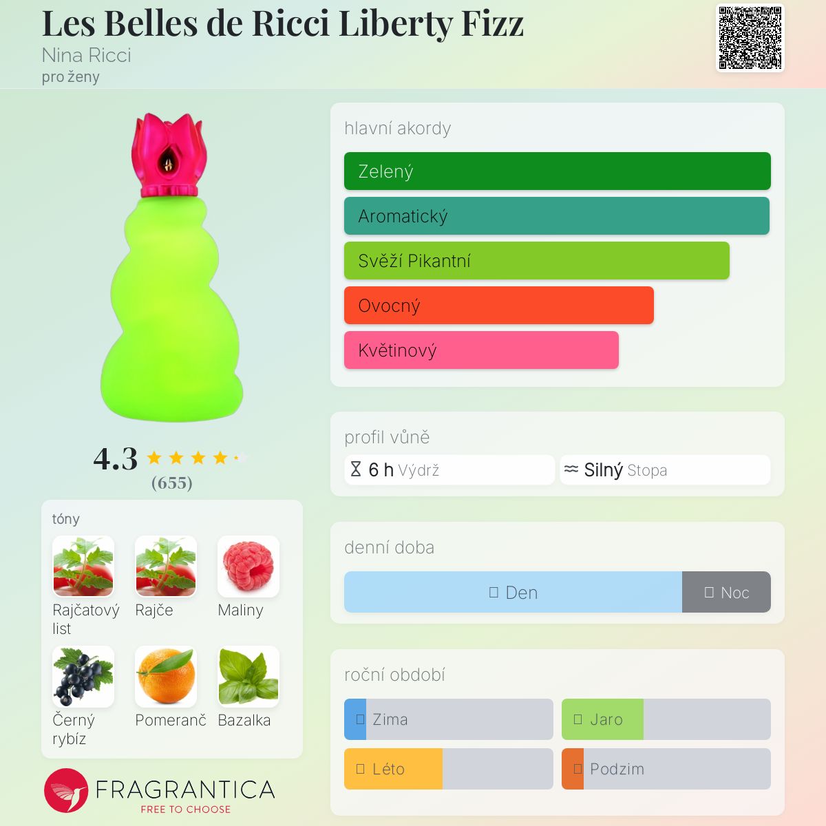 Les Belles de Ricci Liberty Fizz podle Nina Ricci je Floral Fruity vůně pro ženy. Les Belles de Ricci Liberty Fizz byl/a uveden/a v roce 1996. Vrchní tóny jsou Rajčatový list, Černý rybíz, Pomeranč, Bazalka a Máta; střední tóny jsouRajčatový květ, Frézie, Magnólie a Vistárie ; základní tóny jsou Rajče, Maliny a Fíkový list.