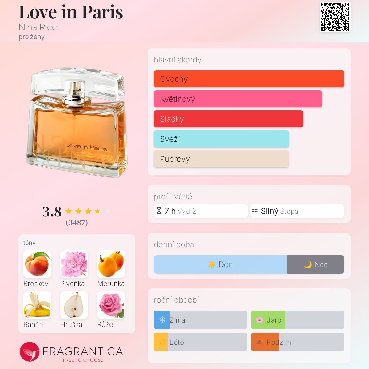 Love in Paris podle Nina Ricci je Floral vůně pro ženy. Love in Paris byl/a uveden/a v roce 2004. "Nosem" za touto vůní je Aurélien Guichard. Vrchní tóny jsou Broskev, Pivoňka, Banán, Hruška, Růže, Badyán a Bergamot; střední tóny jsouMeruňka, Anýz, Jasmín a Fialka ; základní tóny jsou Pižmo a Dřevité tóny.