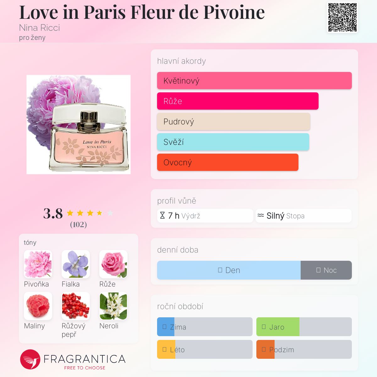 Love in Paris Fleur de Pivoine podle Nina Ricci je Floral vůně pro ženy. Love in Paris Fleur de Pivoine byl/a uveden/a v roce 2009. "Nosem" za touto vůní je Aurélien Guichard. Vrchní tóny jsou Růžový pepř, Neroli, Černý rybíz a Mandarinka; střední tóny jsouPivoňka, Fialka, Růže de Mai a Maliny ; základní tóny jsou Otočník, Pižmo a Pačuli.