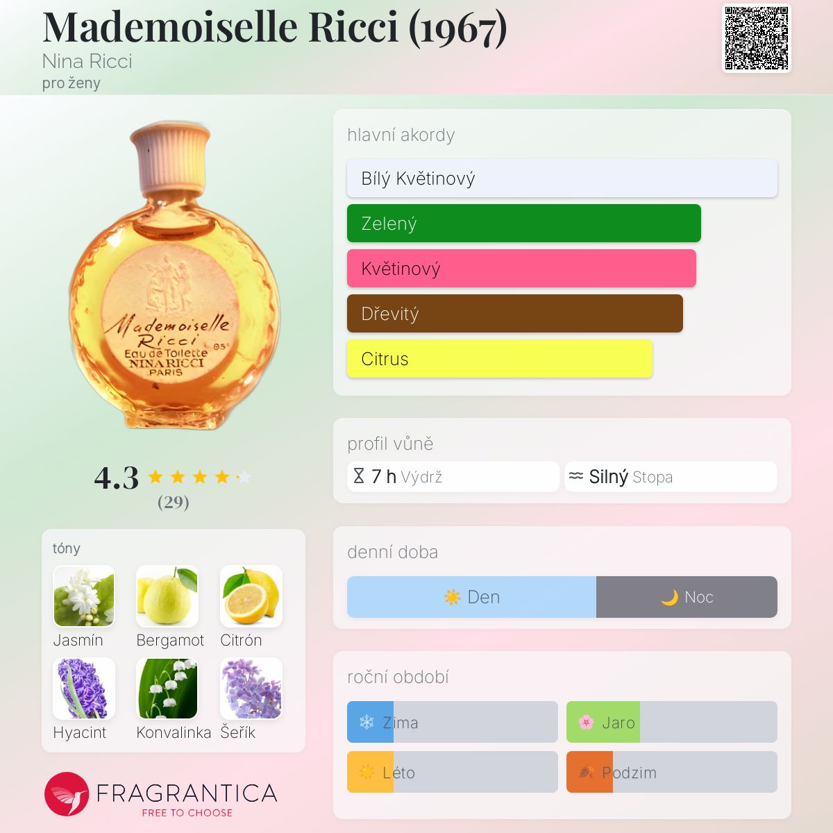 Mademoiselle Ricci (1967) podle Nina Ricci je Floral Green vůně pro ženy. Mademoiselle Ricci (1967) byl/a uveden/a v roce 1967. "Nosem" za touto vůní je Michel Hy. Vrchní tóny jsou Bergamot, Citrón, Hyacint, Fialkový list a Galbanum; střední tóny jsouJasmín, Konvalinka, Šeřík, Narcis, Královská lilie, Koření, Kosatec, Růže a Zimolez ; základní tóny jsou Dubový mech, Pačuli, Santalové dřevo, Cedr, Jantar (ambra) a Pižmo.