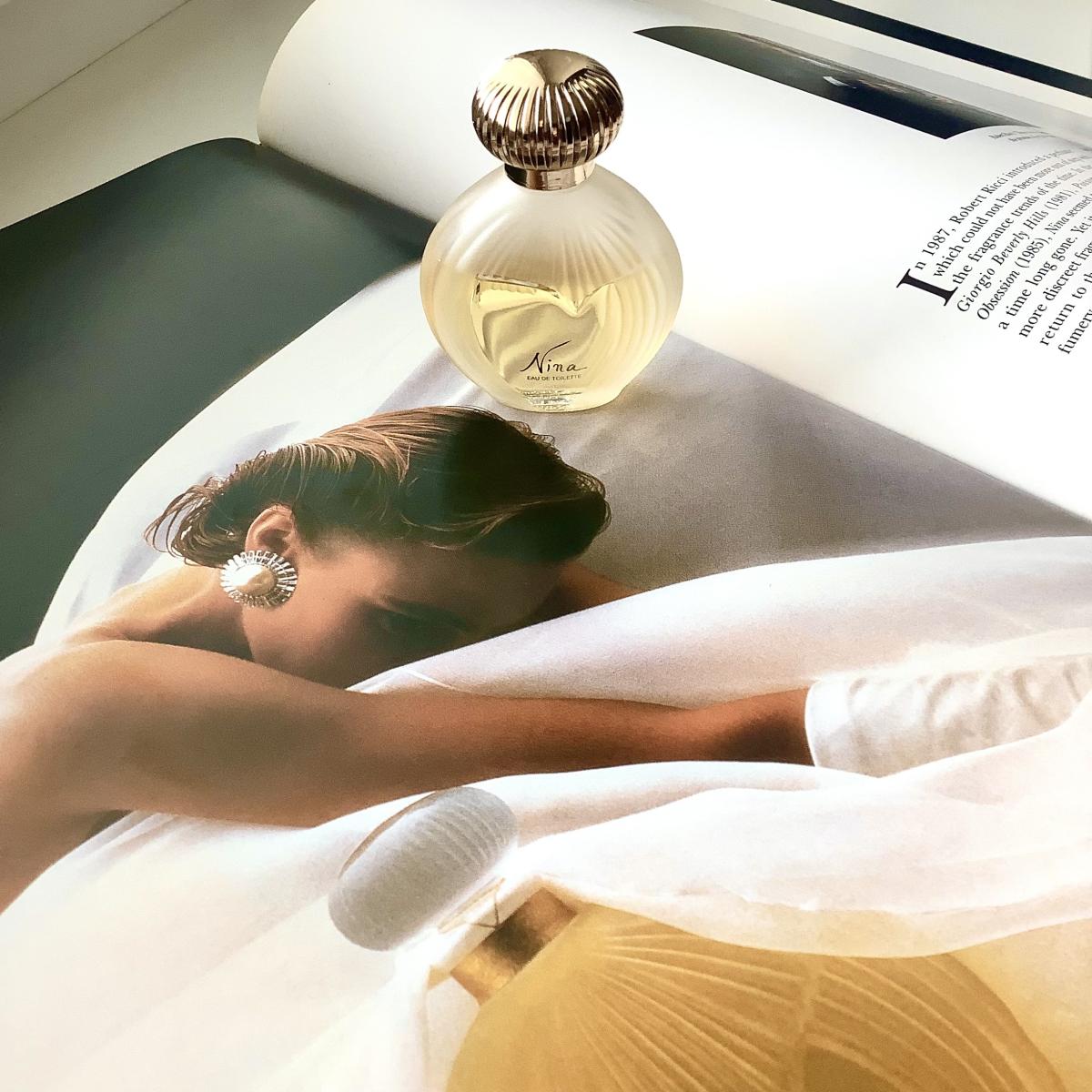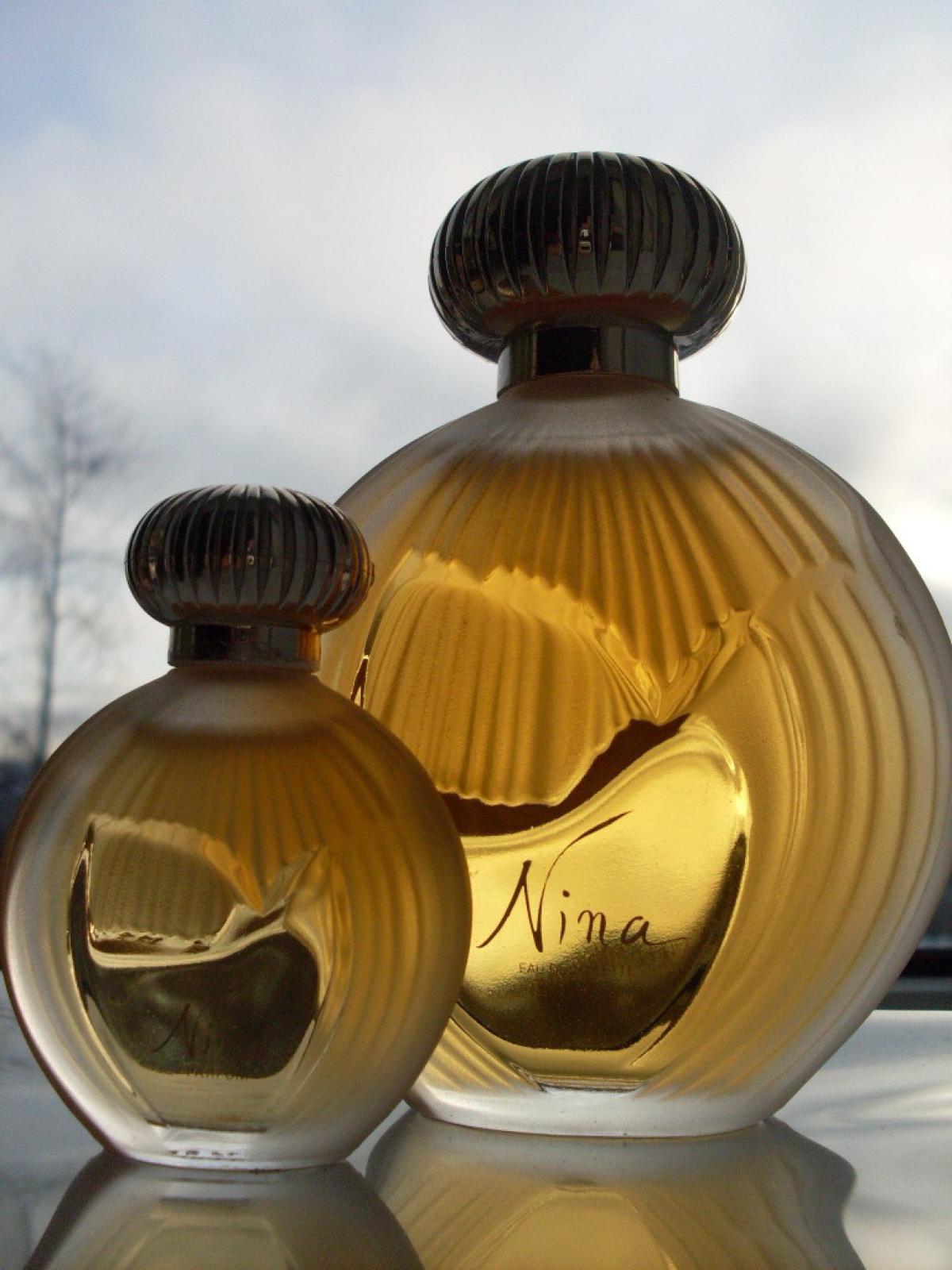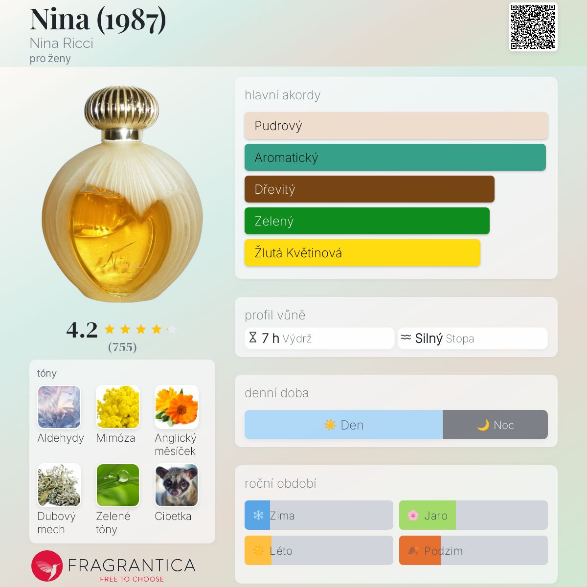 Nina (1987) podle Nina Ricci je Floral Aldehyde vůně pro ženy. Nina (1987) byl/a uveden/a v roce 1987. "Nosem" za touto vůní je Christian Vacchiano. Vrchní tóny jsou Aldehydy, Mimóza, Měsíček, Zelené tóny, Bazalka, Poupata rybízu, Pomerančový květ, Bergamot, Broskev a Citrón; střední tóny jsouMimóza, Ylang-Ylang, Fialka, Kořen kosatce, Jasmín, Pimentovník a Růže ; základní tóny jsou Dubový mech, Cibetka, Kosatec, Pižmo, Sirup z černého rybízu, Vetiver, Santalové dřevo a Pačuli.