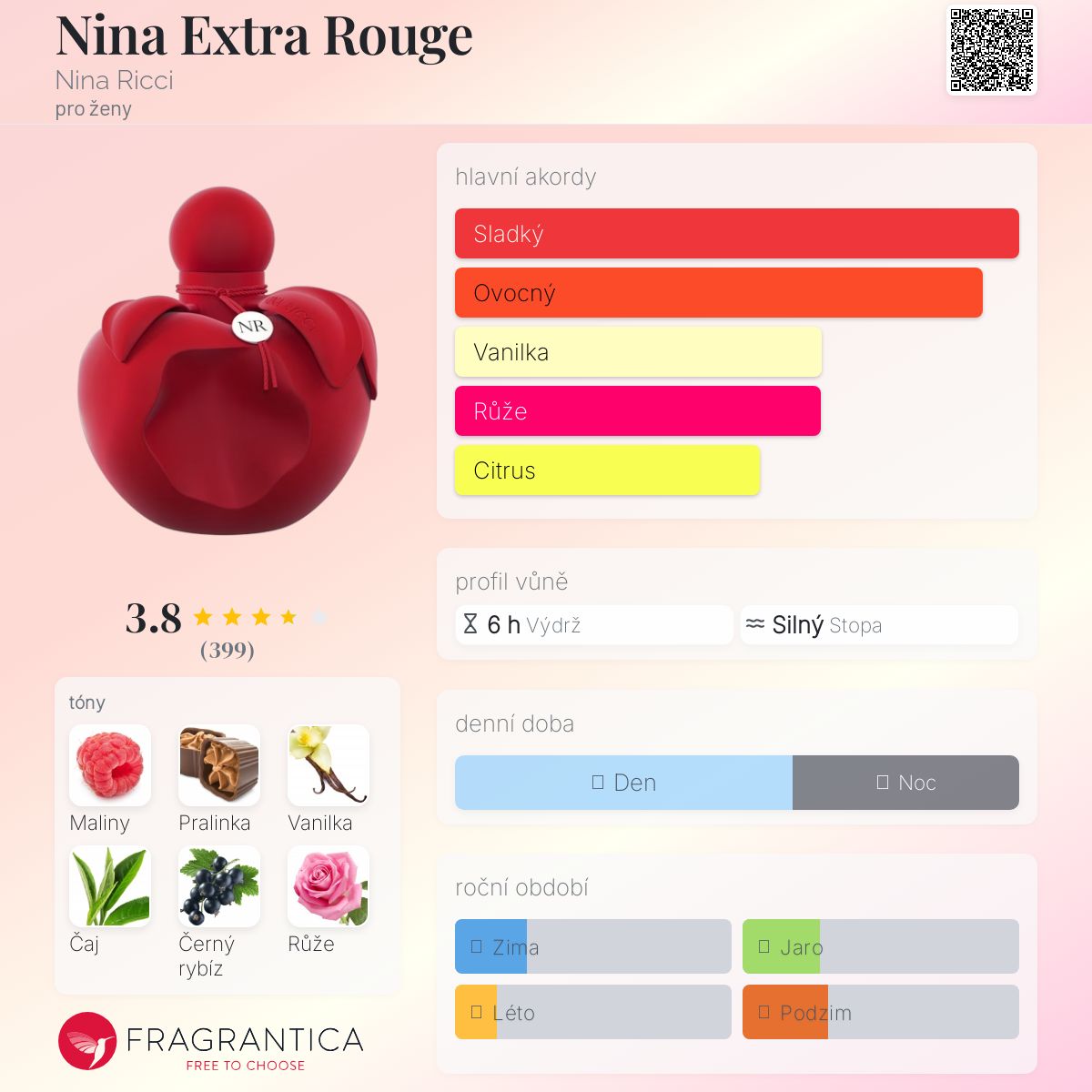 Nina Extra Rouge podle Nina Ricci je Floral Fruity Gourmand vůně pro ženy. Nina Extra Rouge byl/a uveden/a v roce 2021. "Nosem" za touto vůní je Olivier Cresp. Vrchní tóny jsou Maliny, Černý rybíz a Grapefruit; střední tóny jsouČaj a Růže ; základní tóny jsou Pralinka a Vanilka.