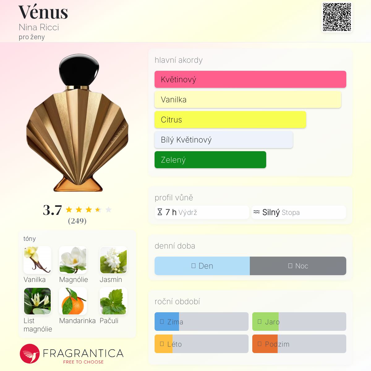Vénus podle Nina Ricci je Chypre Floral vůně pro ženy. Toto je nová vůně. Vénus byl/a uveden/a v roce 2024. Vénus byl/a vytvořen/a Alexandra Monet, Nathalie Lorson a Olivier Cresp. Vrchní tóny jsou List magnólie a Mandarinka; střední tóny jsouMagnólie a Jasmín ; základní tóny jsou Vanilka a Pačuli.