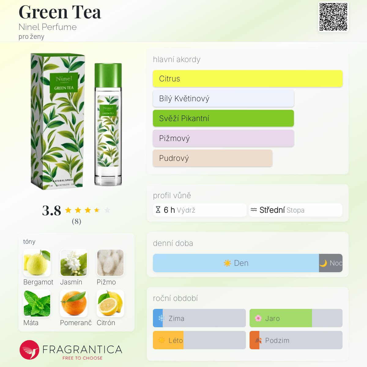 Green Tea podle Ninel Perfume je Aromatic Fougere vůně pro ženy. Green Tea byl/a uveden/a v roce 2015. Vrchní tóny jsou Bergamot, Máta, Pomeranč a Citrón; střední tóny jsouJasmín, Hřebíček, Dubový mech a Bílý jantar (ambra) ; základní tóny jsou Pižmo, Jasmín, Římský kmín a Jantar (ambra).