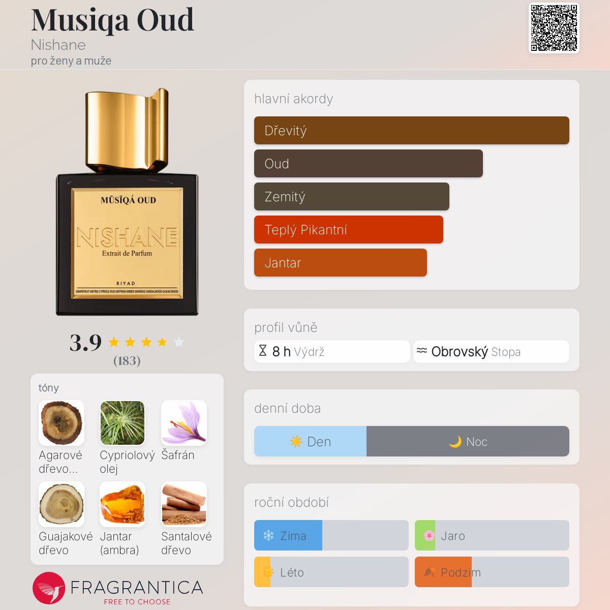 Musiqa Oud podle Nishane je Orientální Woody vůně pro ženy a muže. Musiqa Oud byl/a uveden/a v roce 2015. "Nosem" za touto vůní je Jorge Lee. Vrchní tóny jsou Cypriolový olej, Amyris a Grapefruit; střední tóny jsouAgarové dřevo (oud), Šafrán a Jantar (ambra) ; základní tóny jsou Guajakové dřevo, Santalové dřevo a Dubový mech.