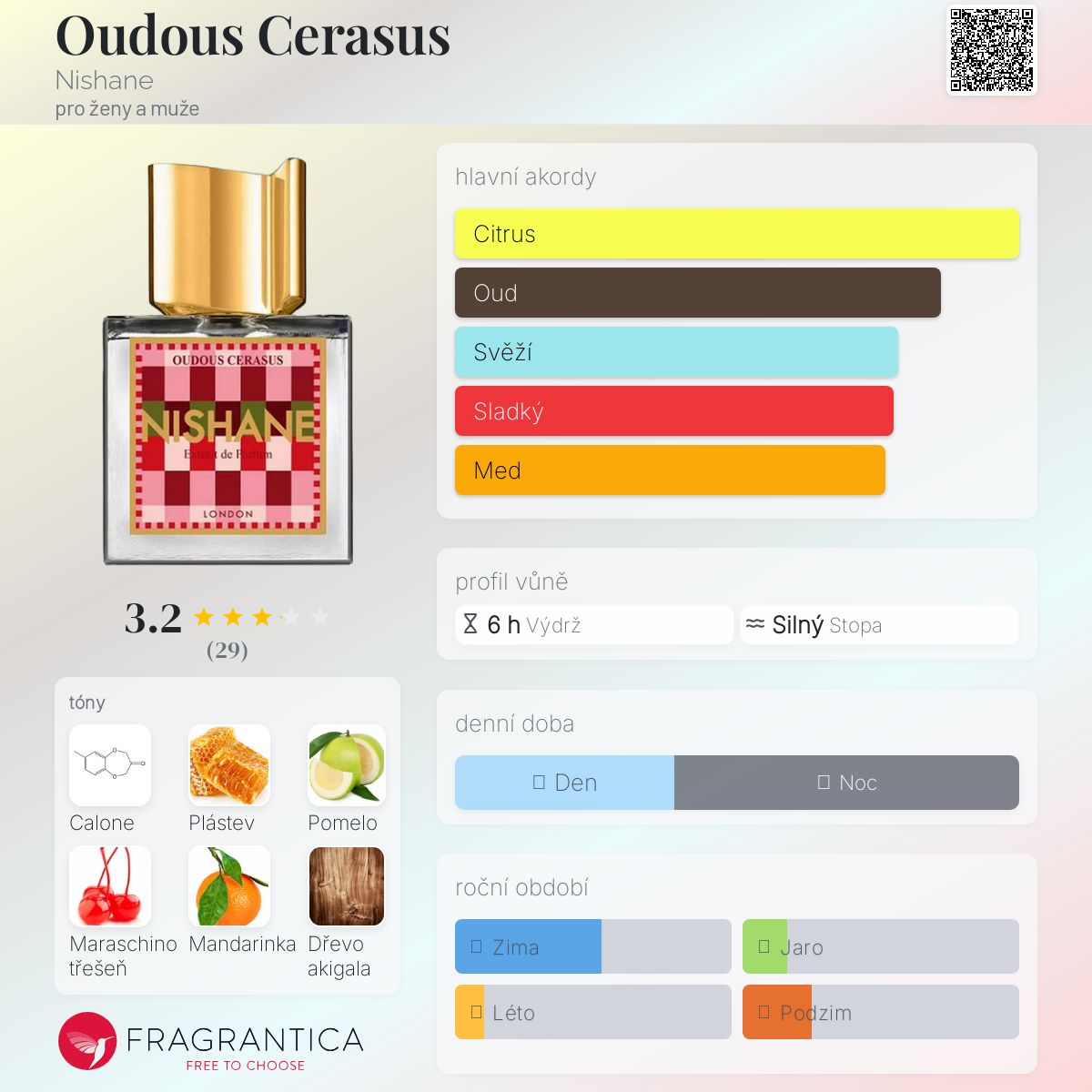 Oudous Cerasus podle Nishane je vůně pro ženy a muže. Toto je nová vůně. Oudous Cerasus byl/a uveden/a v roce 2025. "Nosem" za touto vůní je Jordi Fernández. Vrchní tóny jsou Calone, Pomelo, Maraschino třešeň a Italská mandarinka; střední tóny jsouPlástev, Mahonial a Španělské labdanum ; základní tóny jsou Dřevo akigala, Agarové dřevo (oud) a Pačuli.