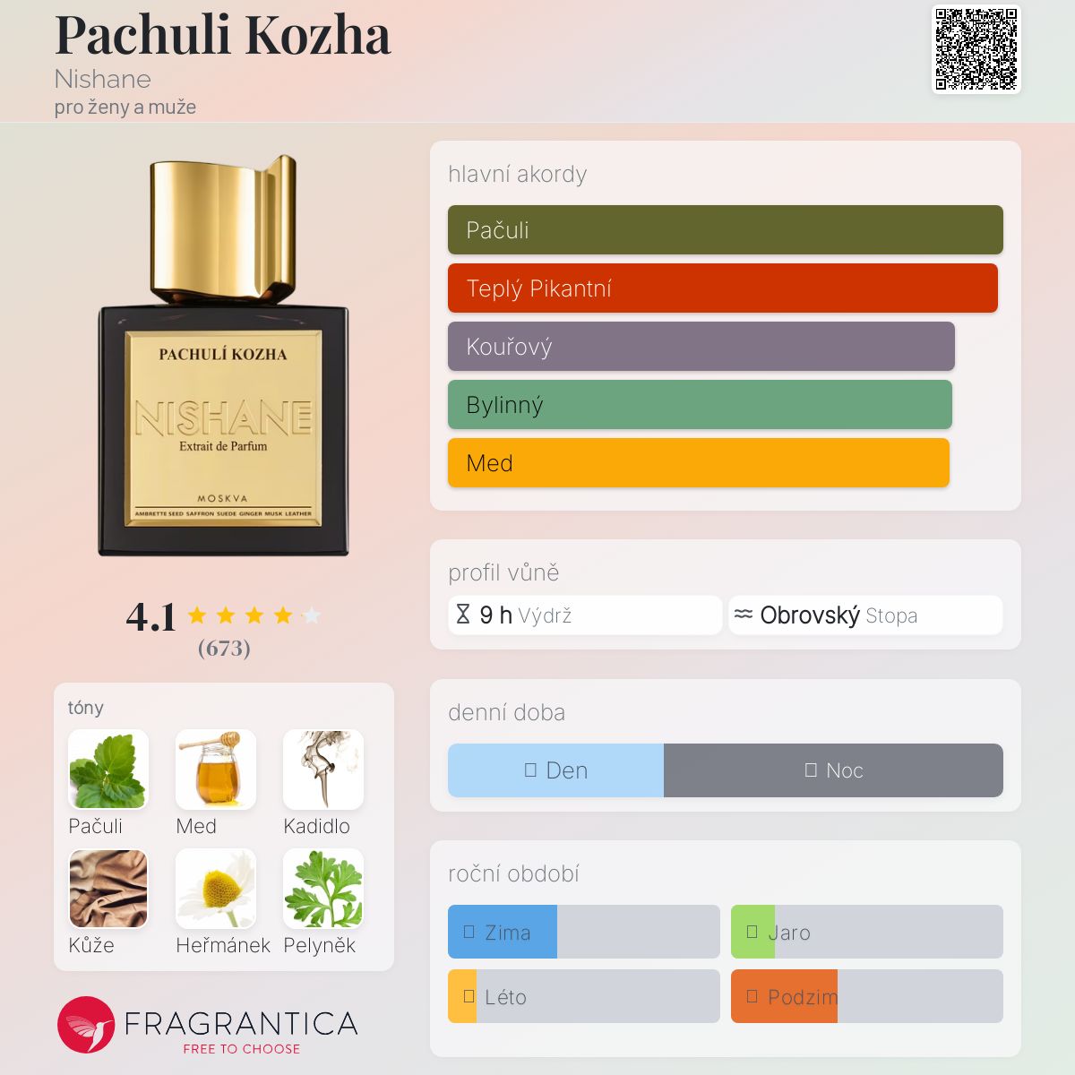 Pachuli Kozha podle Nishane je Leather vůně pro ženy a muže. Pachuli Kozha byl/a uveden/a v roce 2015. "Nosem" za touto vůní je Jorge Lee. Vrchní tóny jsou Heřmánek, Pelyněk, Ylang-Ylang a Hyacint; střední tóny jsouPačuli a Černý pepř ; základní tóny jsou Med, Kadidlo a Kůže.