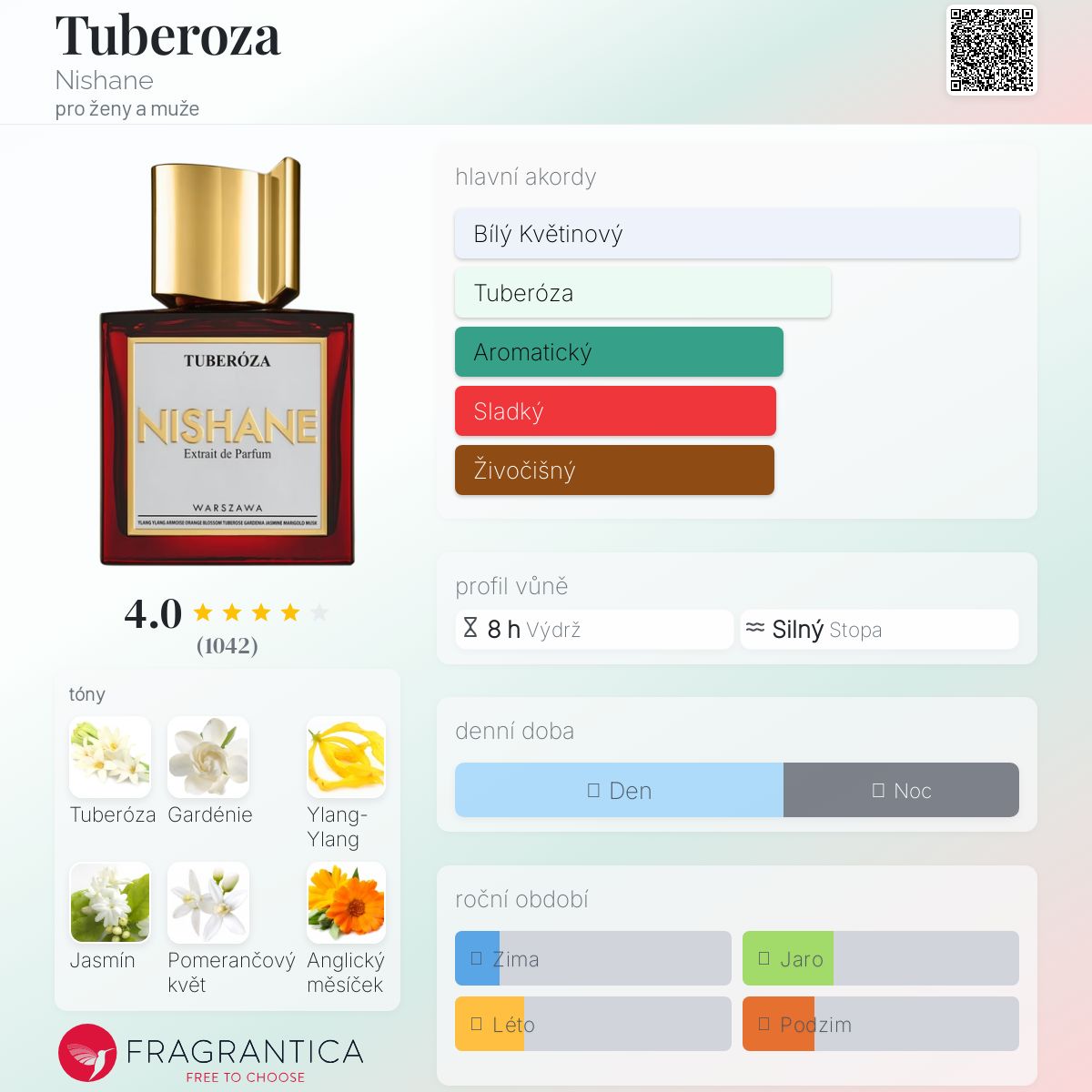 Tuberoza podle Nishane je Orientální Floral vůně pro ženy a muže. Tuberoza byl/a uveden/a v roce 2014. "Nosem" za touto vůní je Jorge Lee. Vrchní tóny jsou Ylang-Ylang, Pomerančový květ, Pelyněk a Sladký pomeranč; střední tóny jsouTuberóza, Gardénie, Jasmín a Měsíček ; základní tóny jsou Vetiver, Jantar (ambra), Pižmo a Santalové dřevo.