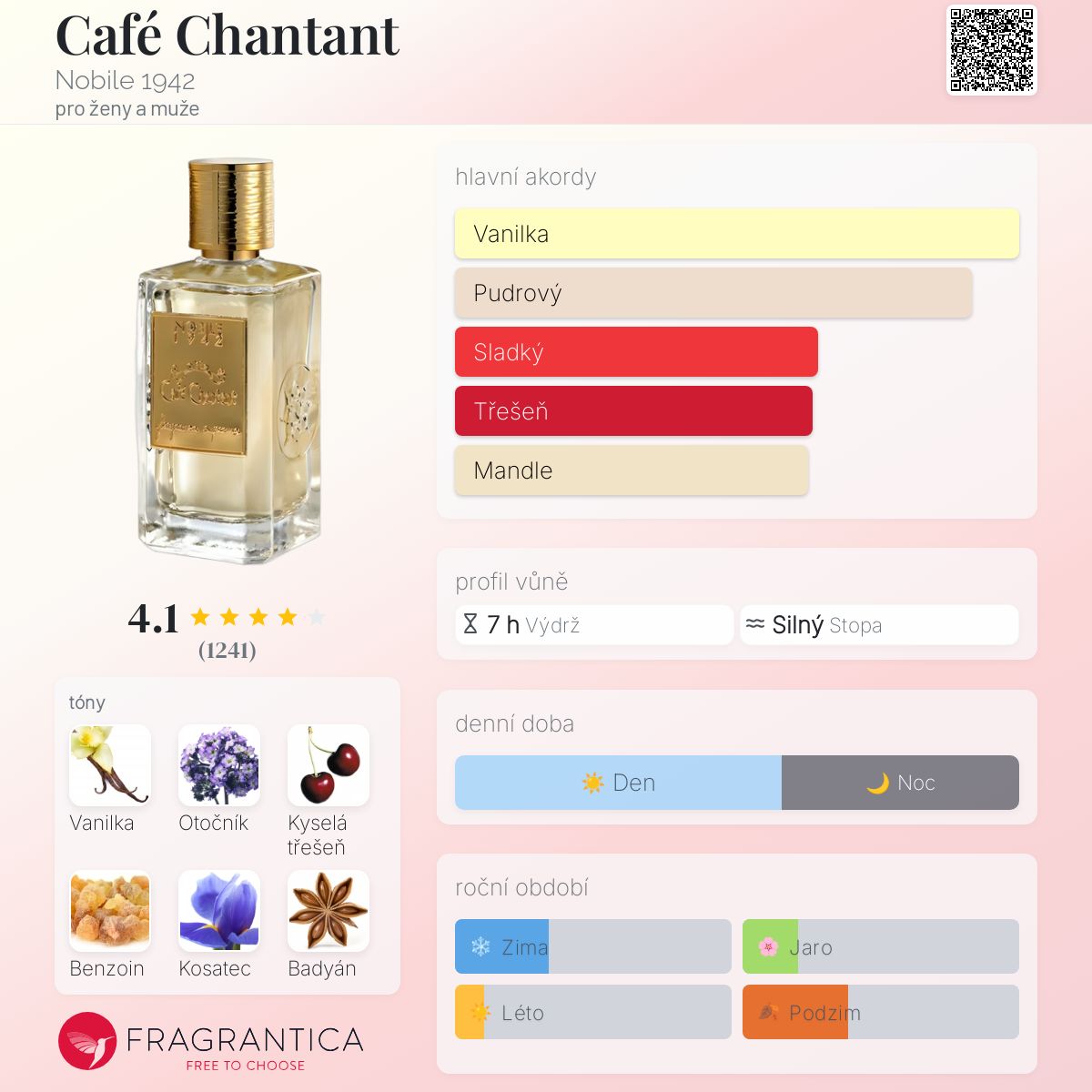 Café Chantant podle Nobile 1942 je Floral Woody Musk vůně pro ženy a muže. Café Chantant byl/a uveden/a v roce 2013. "Nosem" za touto vůní je Mathieu Nardin. Vrchní tóny jsou Kyselá třešeň, Badyán a Vavříny; střední tóny jsouOtočník a Kosatec ; základní tóny jsou Vanilka, Benzoin, Pižmo a Pačuli.
