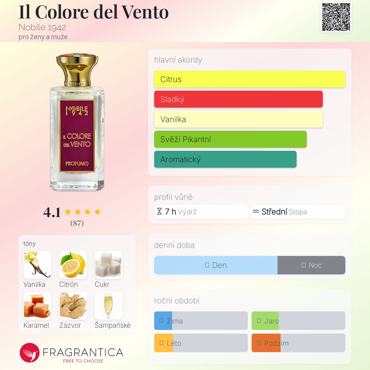 Il Colore del Vento podle Nobile 1942 je Orientální Vanilla vůně pro ženy a muže. Toto je nová vůně. Il Colore del Vento byl/a uveden/a v roce 2025. "Nosem" za touto vůní je Maria Celeste Lombardo. Vrchní tóny jsou Citrón, Zázvor, Kardamom, Černý pepř a Koriandr; střední tóny jsouCukr, Šampaňské, Bergamot a Káva ; základní tóny jsou Vanilka, Karamel, Máslo, Jantar (ambra) a Bílé pižmo.