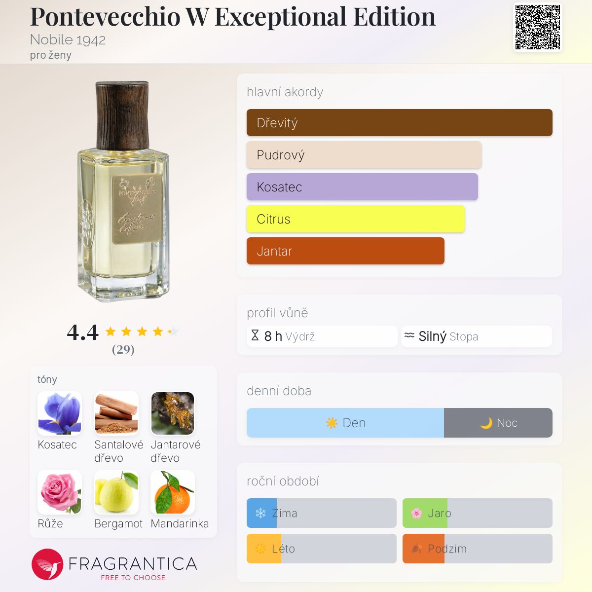Pontevecchio W Exceptional Edition podle Nobile 1942 je Floral Woody Musk vůně pro ženy. Pontevecchio W Exceptional Edition byl/a uveden/a v roce 2015. "Nosem" za touto vůní je Marie Duchêne.