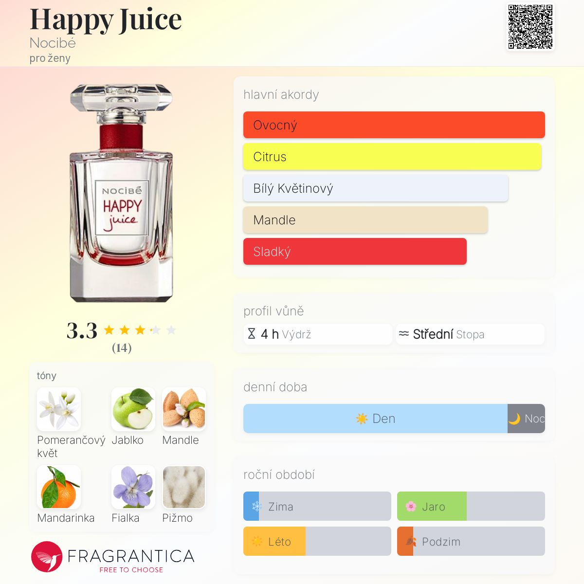 Happy Juice podle Nocibé je Floral Fruity Gourmand vůně pro ženy. Happy Juice byl/a uveden/a v roce 2017. "Nosem" za touto vůní je Karine Vinchon Spehner. Vrchní tóny jsou Jablko, Mandle a Mandarinka; střední tóny jsouPomerančový květ, Fialka a Růže ; základní tóny jsou Bílé pižmo, Pačuli a Santalové dřevo.