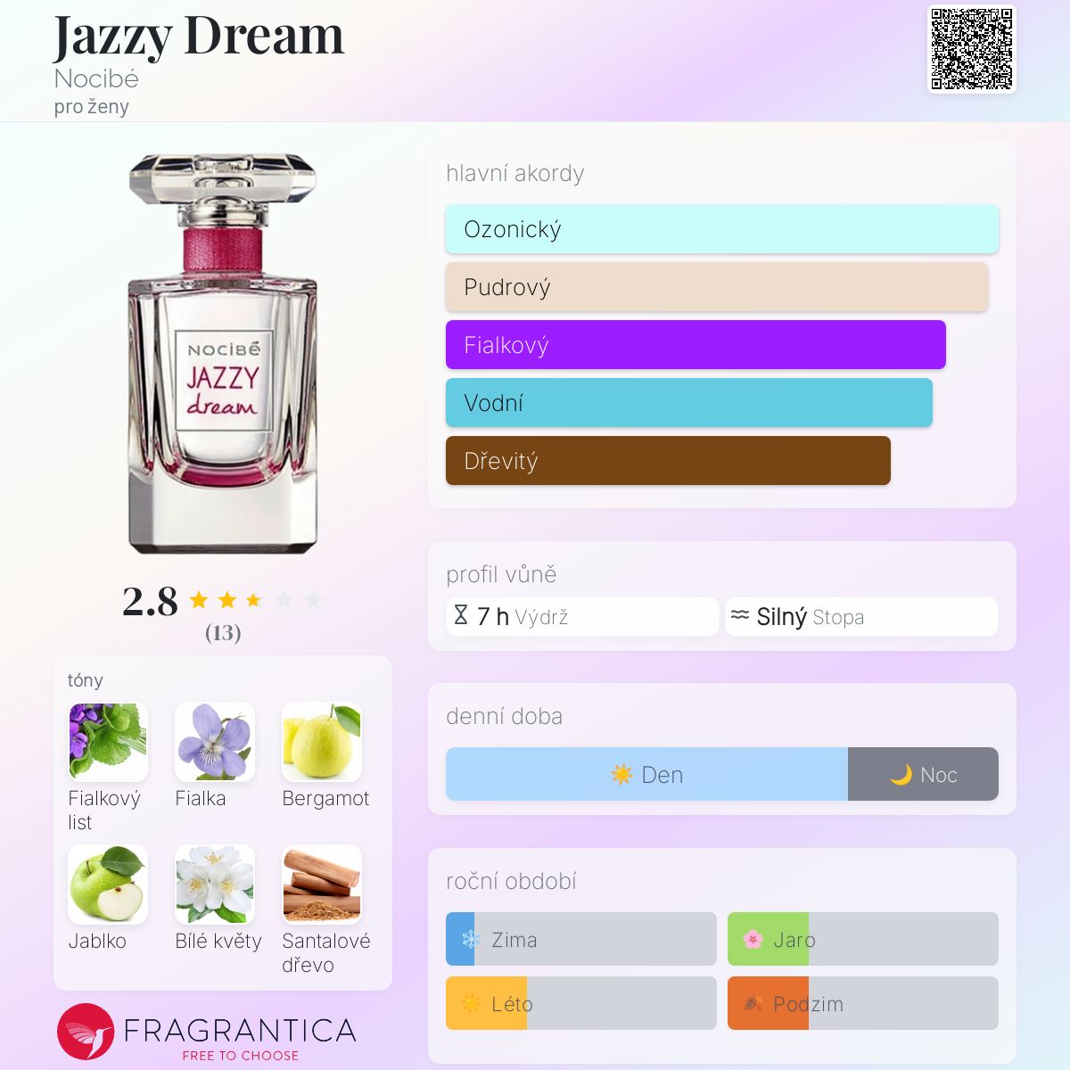 Jazzy Dream podle Nocibé je Floral vůně pro ženy. Jazzy Dream byl/a uveden/a v roce 2017. "Nosem" za touto vůní je Dorothée Piot. Vrchní tóny jsou Fialkový list, Bergamot a Jablko; střední tóny jsouFialka, Bílé květy, Růže a Ylang-Ylang ; základní tóny jsou Santalové dřevo, Vetiver, Bílé pižmo a Dubový mech.