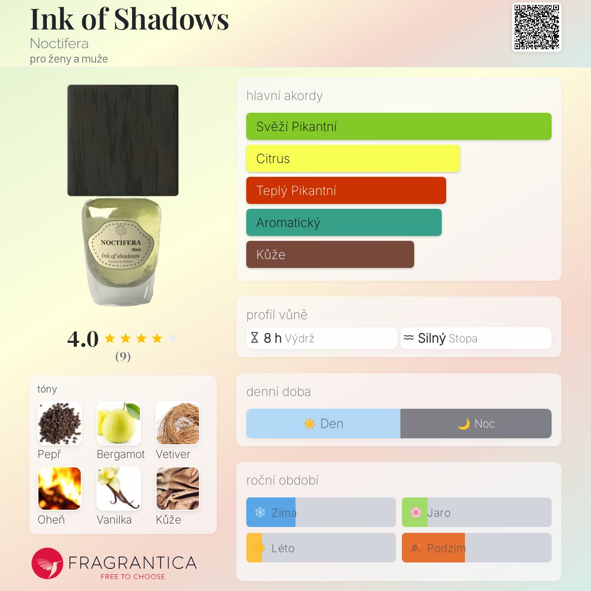 Ink of Shadows podle Noctifera je vůně pro ženy a muže. Vrchní tóny jsou Černý pepř a Bergamot; střední tóny jsouVetiver a Oheň ; základní tóny jsou Vanilka, Kůže a Pižmo.