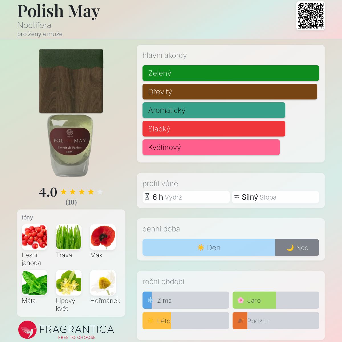 Polish May podle Noctifera je vůně pro ženy a muže. Vrchní tóny jsou Lesní jahoda, Tráva, Mák a Máta; střední tóny jsouLipový květ, Heřmánek, Jasmín a Borovice ; základní tóny jsou Santalové dřevo a Pryskyřice.