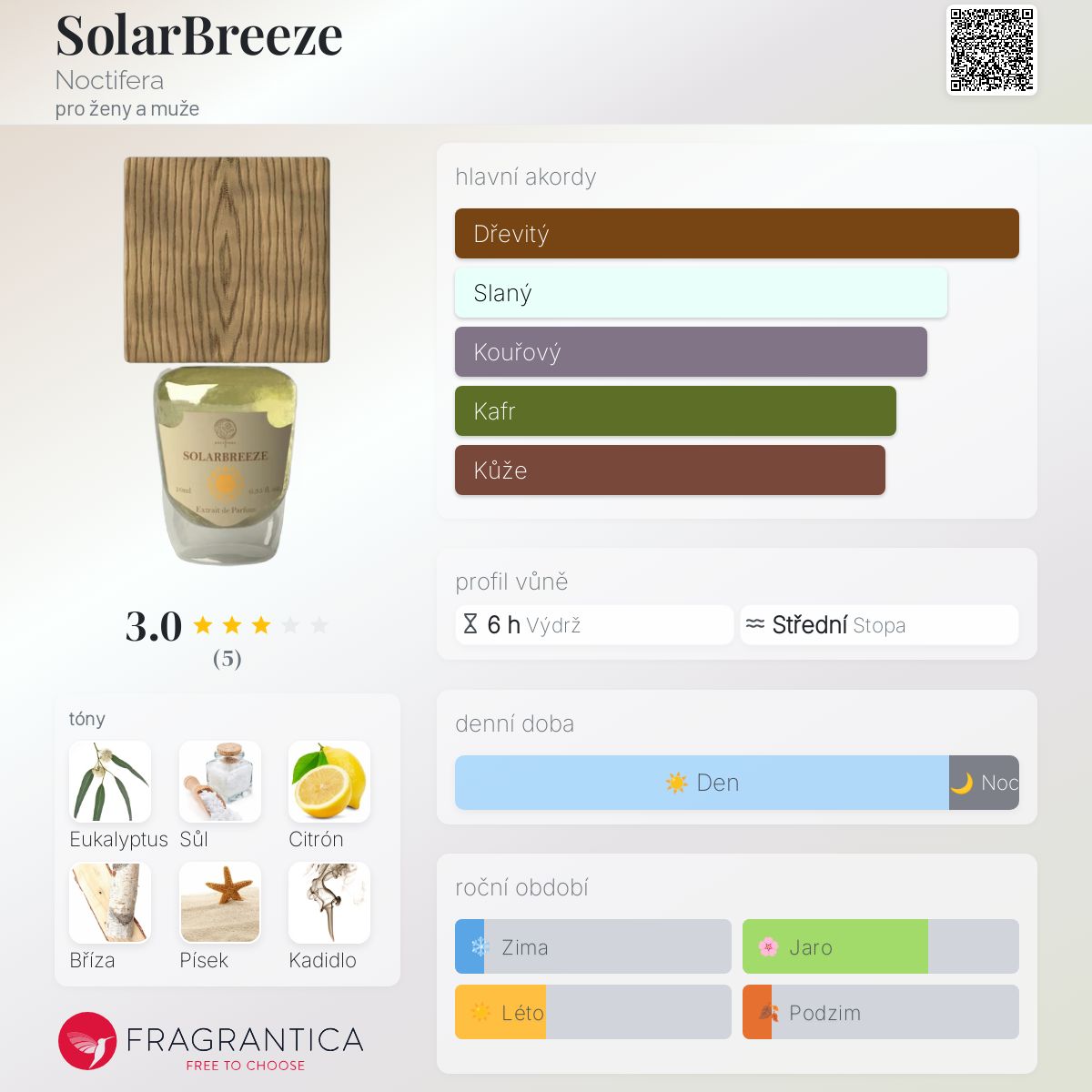 SolarBreeze podle Noctifera je vůně pro ženy a muže. Vrchní tóny jsou Eukalyptus a Citrón; střední tóny jsouBříza, Kadidlo a Jantar (ambra) ; základní tóny jsou Mořská sůl, Písek a Řasy.
