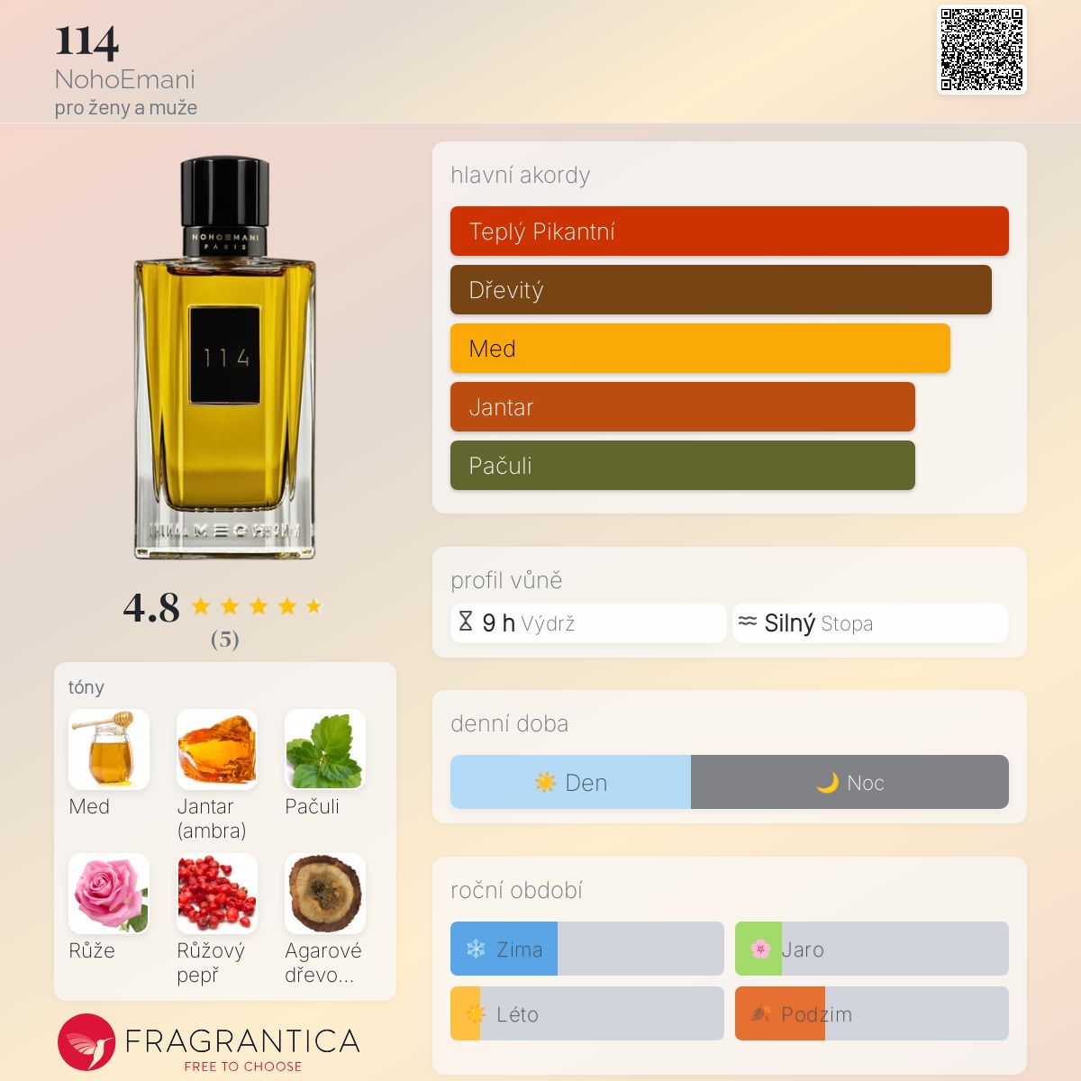 114 podle NohoEmani je vůně pro ženy a muže. Toto je nová vůně. 114 byl/a uveden/a v roce 2024. Vrchní tóny jsou Med, Skořice, Zázvor a Citrusy; střední tóny jsouJantar (ambra), Turecká růže a Růžový pepř ; základní tóny jsou Pačuli, Agarové dřevo (oud), Santalové dřevo a Vanilka.
