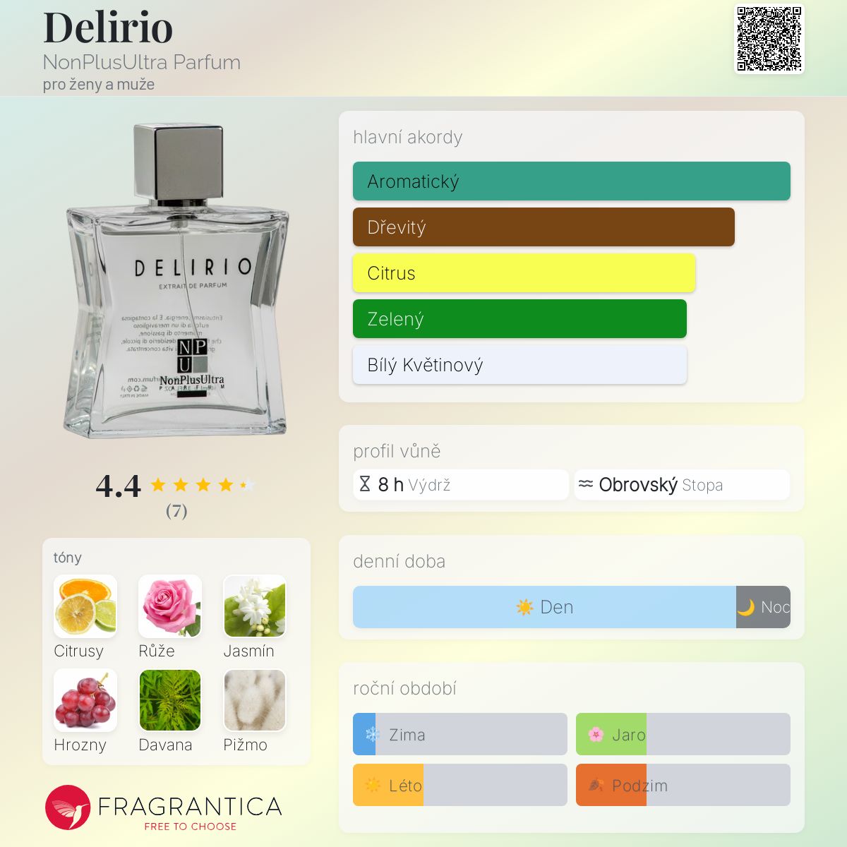 Delirio podle NonPlusUltra Parfum je Orientální Floral vůně pro ženy a muže. Delirio byl/a uveden/a v roce 2021. Vrchní tóny jsou Citrusy a Damašská růže; střední tóny jsouJasmín, Hrozny a Davana ; základní tóny jsou Pižmo, Jantar (ambra), Vetiver a Pačuli.