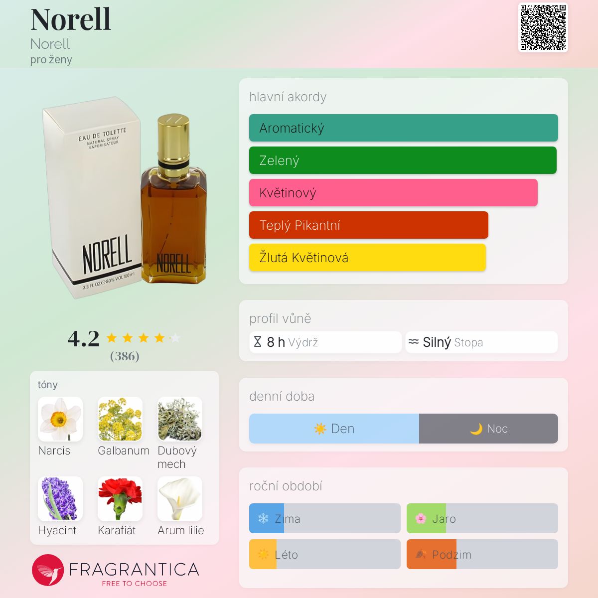 Norell podle Norell je Floral Woody Musk vůně pro ženy. Norell byl/a uveden/a v roce 1968. "Nosem" za touto vůní je Josephine Catapano. Vrchní tóny jsou Narcis, Galbanum, Hyacint, Levandule, Bergamot, Citrón a Mandarinka; střední tóny jsouKarafiát, Kala, Koriandr, Růže, Mimóza, Kosatec, Gardénie, Ylang-Ylang, Kardamom, Jasmín, Skořice a Orchidej ; základní tóny jsou Dubový mech, Vetiver, Myrha, Pižmo, Jantar (ambra), Cedr, Santalové dřevo a Vanilka.