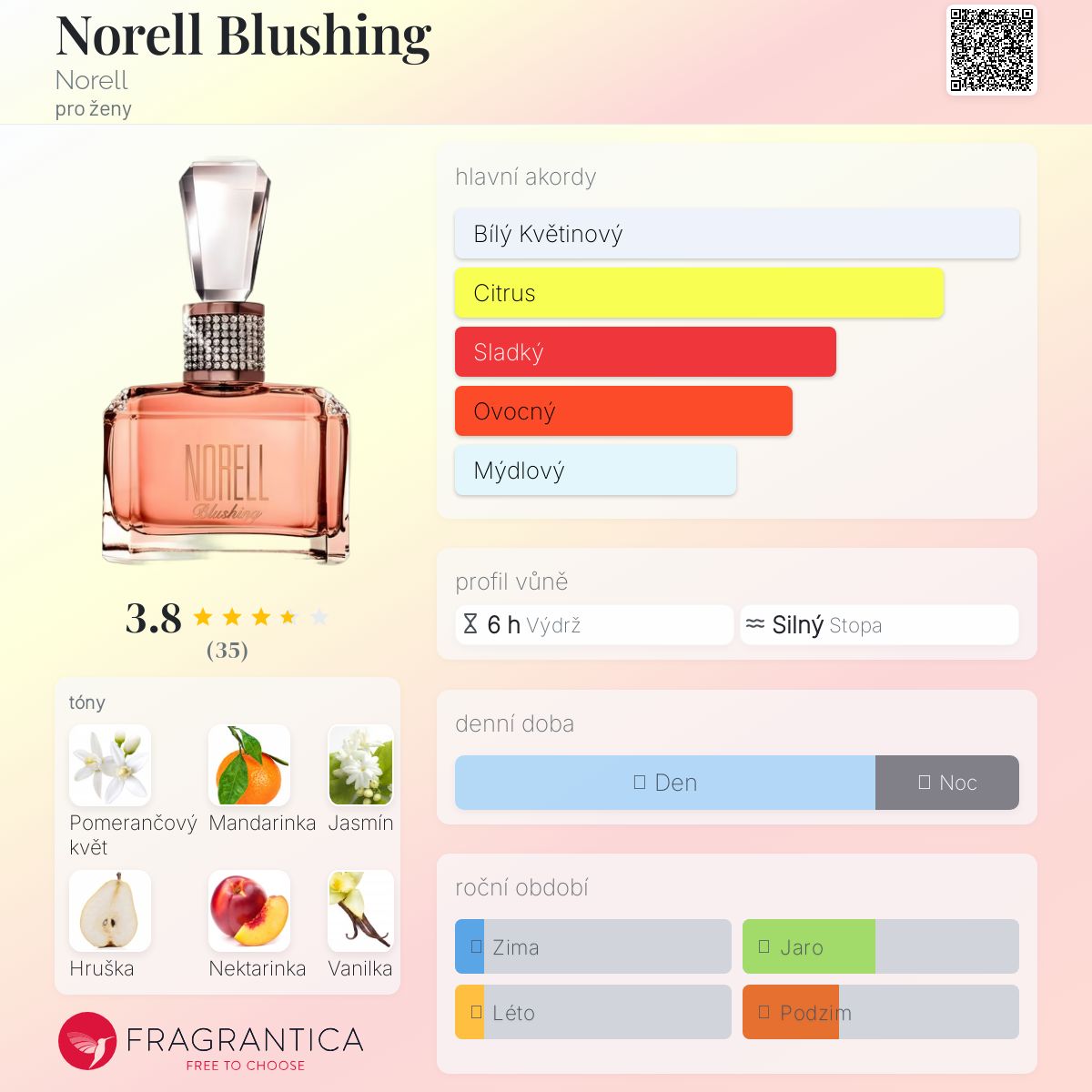 Norell Blushing podle Norell je Floral vůně pro ženy. Norell Blushing byl/a uveden/a v roce 2017. Vrchní tóny jsou Mandarinka, Hruška a Nektarinka; střední tóny jsouPomerančový květ, Jasmín a Damašská růže ; základní tóny jsou Vanilka, Santalové dřevo a Bříza.