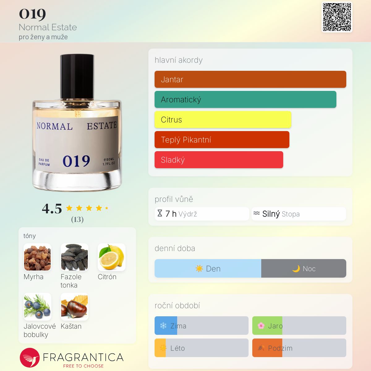 019 podle Normal Estate je Woody Aromatic vůně pro ženy a muže. 019 byl/a uveden/a v roce 2022. "Nosem" za touto vůní je Alice Lavenat.