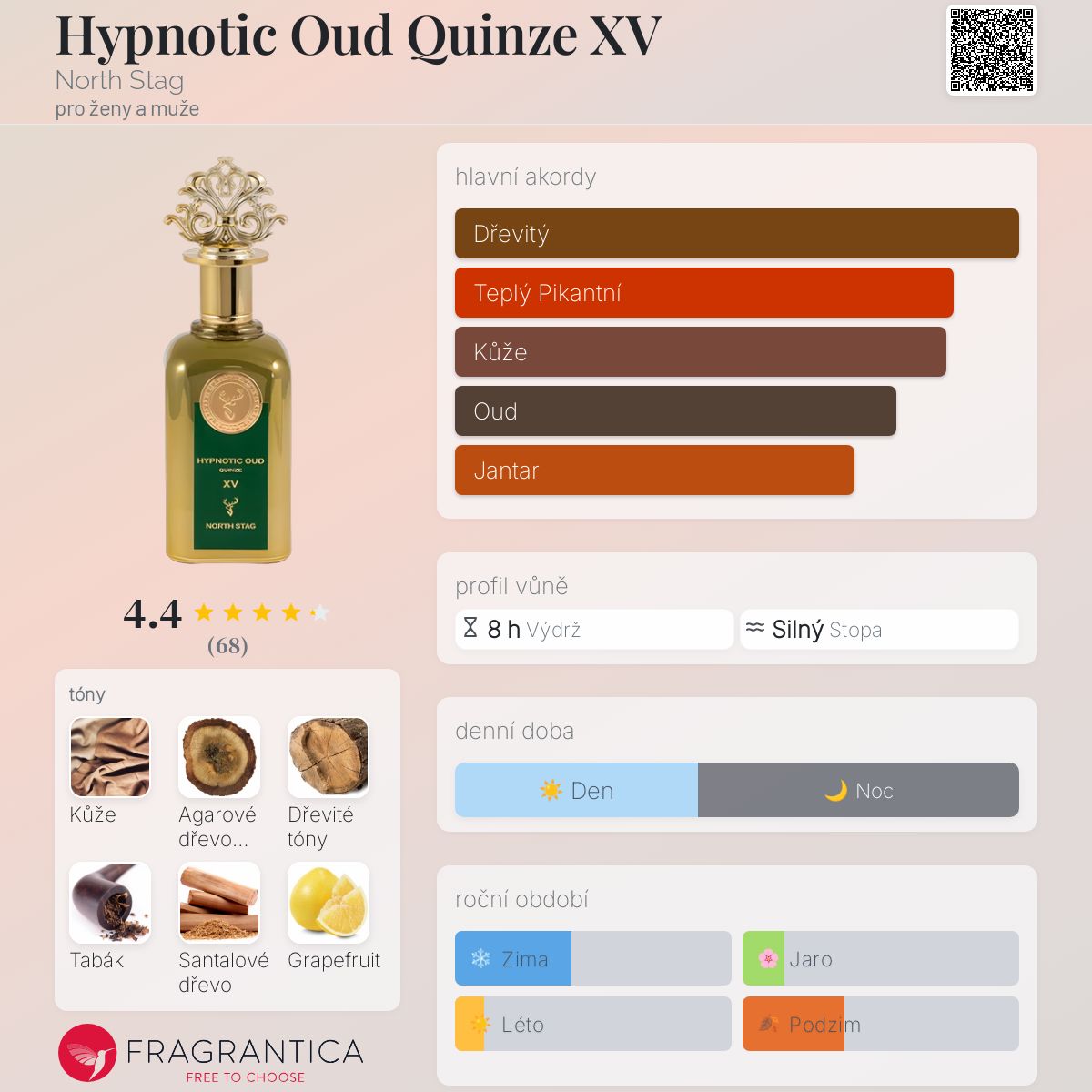 Hypnotic Oud Quinze XV podle North Stag je Leather vůně pro ženy a muže. Hypnotic Oud Quinze XV byl/a uveden/a v roce 2023. Vrchní tóny jsou Grapefruit, Šafrán, Kardamom, Skořice, Labdanum a Cypriolový olej; střední tóny jsouDřevité tóny, Tabák, Santalové dřevo, Jantar (ambra) a Jasmín ; základní tóny jsou Kůže, Agarové dřevo (oud), Fazole tonka a Pižmo.