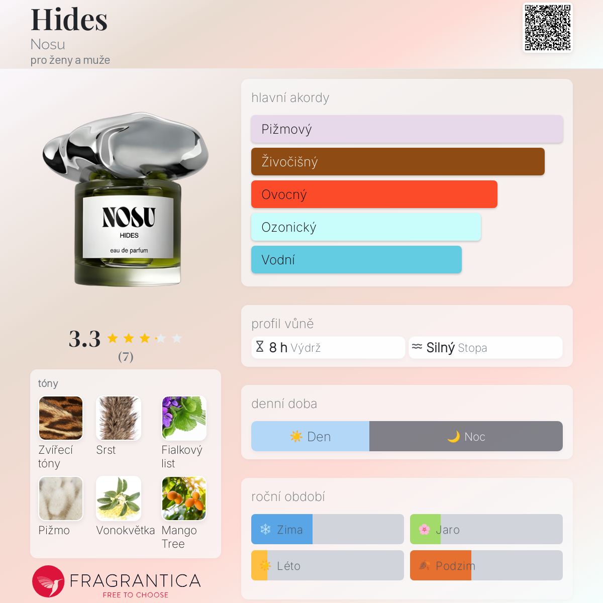 Hides podle Nosu je vůně pro ženy a muže. Toto je nová vůně. Hides byl/a uveden/a v roce 2025. Vrchní tóny jsou Zvířecí tóny, Fialkový list, Vonokvětka a Maliny; střední tóny jsouSrst, Mangovník a Dřevité tóny ; základní tóny jsou Pižmo, Mech a Pačuli.
