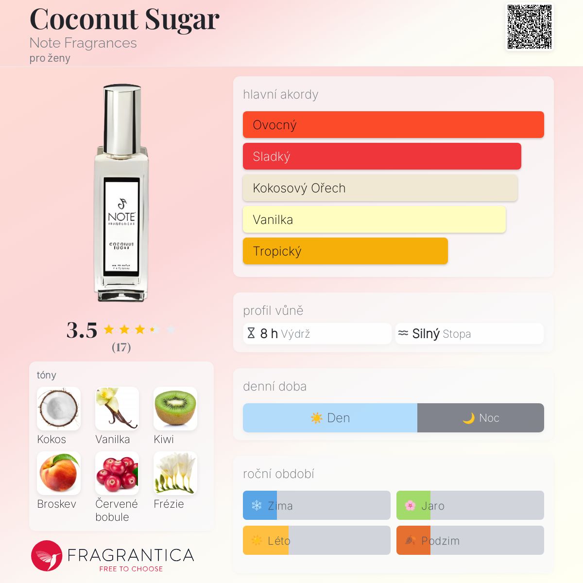 Coconut Sugar podle Note Fragrances je Floral Fruity Gourmand vůně pro ženy. Coconut Sugar byl/a uveden/a v roce 2013. "Nosem" za touto vůní je Danielle Fleming. Vrchní tóny jsou Kiwi, Broskev a Červené bobule; střední tóny jsouKokosové mléko, Frézie a Rýže basmati ; základní tóny jsou Vanilkový lusk a Bílé pižmo.