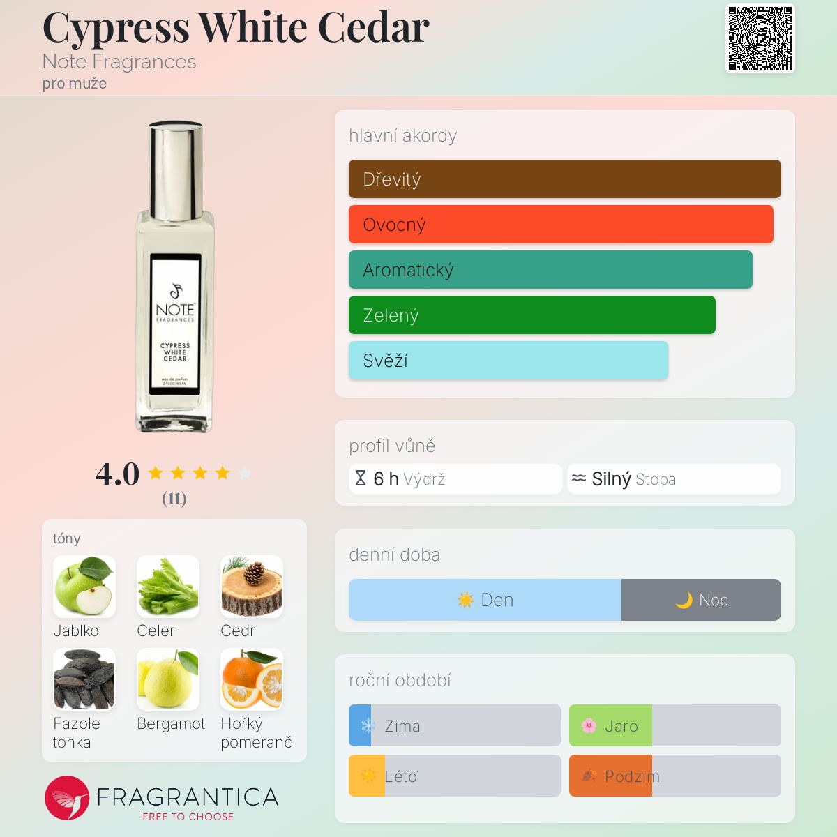 Cypress White Cedar podle Note Fragrances je Woody vůně pro muže. Cypress White Cedar byl/a uveden/a v roce 2016. "Nosem" za touto vůní je Danielle Fleming. Vrchní tóny jsou Bergamot, Hořký pomeranč a Zlatobýl; střední tóny jsouZelené jablko, Celer, Vavříny a Fík ; základní tóny jsou Virginský cedr, Fazole tonka, Cypřiš a Pačuli.