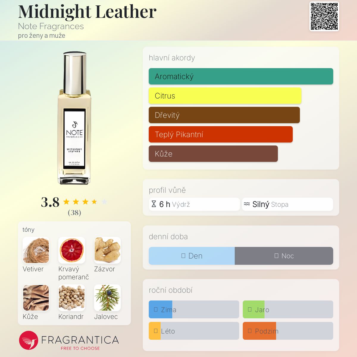 Midnight Leather podle Note Fragrances je Orientální Woody vůně pro ženy a muže. Midnight Leather byl/a uveden/a v roce 2013. "Nosem" za touto vůní je Danielle Fleming. Vrchní tóny jsou Krvavý pomeranč, Zázvor a Koriandr; střední tóny jsouKůže, Jalovec a Pazourek ; základní tóny jsou Vetiver, Pačuli, Káva a Tabák.