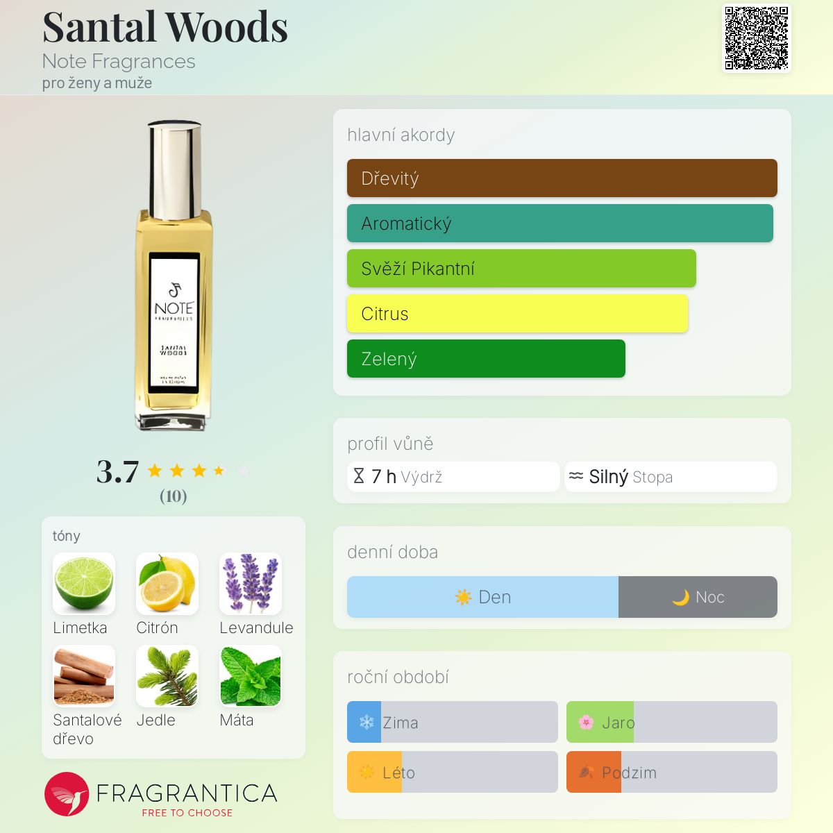 Santal Woods podle Note Fragrances je Aromatic Fougere vůně pro ženy a muže. Santal Woods byl/a uveden/a v roce 2013. "Nosem" za touto vůní je Danielle Fleming. Vrchní tóny jsou Limetka, Citrón a Máta; střední tóny jsouLevandule, Kumarin a Černý pepř ; základní tóny jsou Santalové dřevo, Jedle balzámová, Cypřiš, Dubový mech a Vetiver.