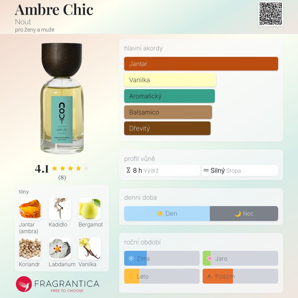 Ambre Chic podle Nout je Orientální vůně pro ženy a muže. Ambre Chic byl/a uveden/a v roce 2021. "Nosem" za touto vůní je Laure-Leta Jacquet. Vrchní tóny jsou Bergamot, Koriandr a Španělské labdanum; střední tóny jsouJantar (ambra), Kadidlo, Labdanum, Vanilka a Elimi ; základní tóny jsou Cedr, Fazole tonka, Siamský (thajský) benzoin a List indonéského pačuli.