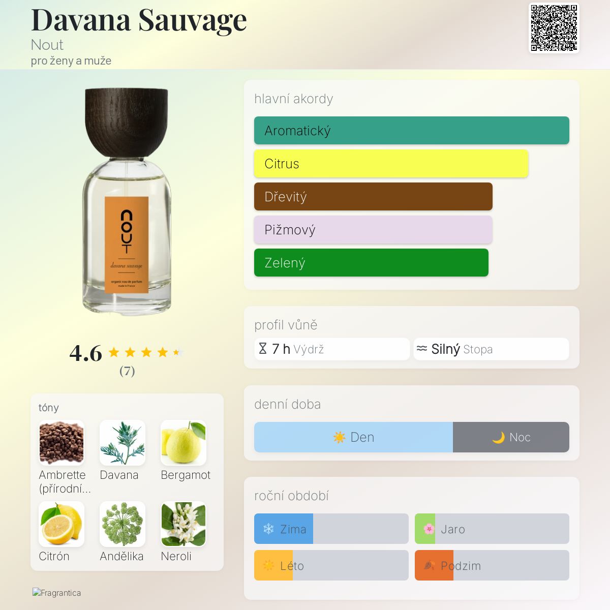Davana Sauvage podle Nout je vůně pro ženy a muže. Davana Sauvage byl/a uveden/a v roce 2021. "Nosem" za touto vůní je Laure-Leta Jacquet. Vrchní tóny jsou Ambrette (přírodní pižmo), Bergamot, Citrón a Andělika; střední tóny jsouDavana, Tuniské neroli a Červené ovoce ; základní tóny jsou List indonéského pačuli, Haitský vetiver, Papyrus, Fazole tonka a Santalové dřevo.