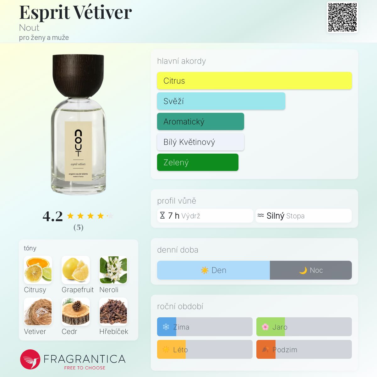 Esprit Vétiver podle Nout je vůně pro ženy a muže. Esprit Vétiver byl/a uveden/a v roce 2021. "Nosem" za touto vůní je Laure-Leta Jacquet. Vrchní tóny jsou Citrusy a Grapefruit; střední tóny jsouTuniské neroli, Madagaskarský hřebíček, Muškátový oříšek a Černý pepř ; základní tóny jsou Haitský vetiver a Cedr.