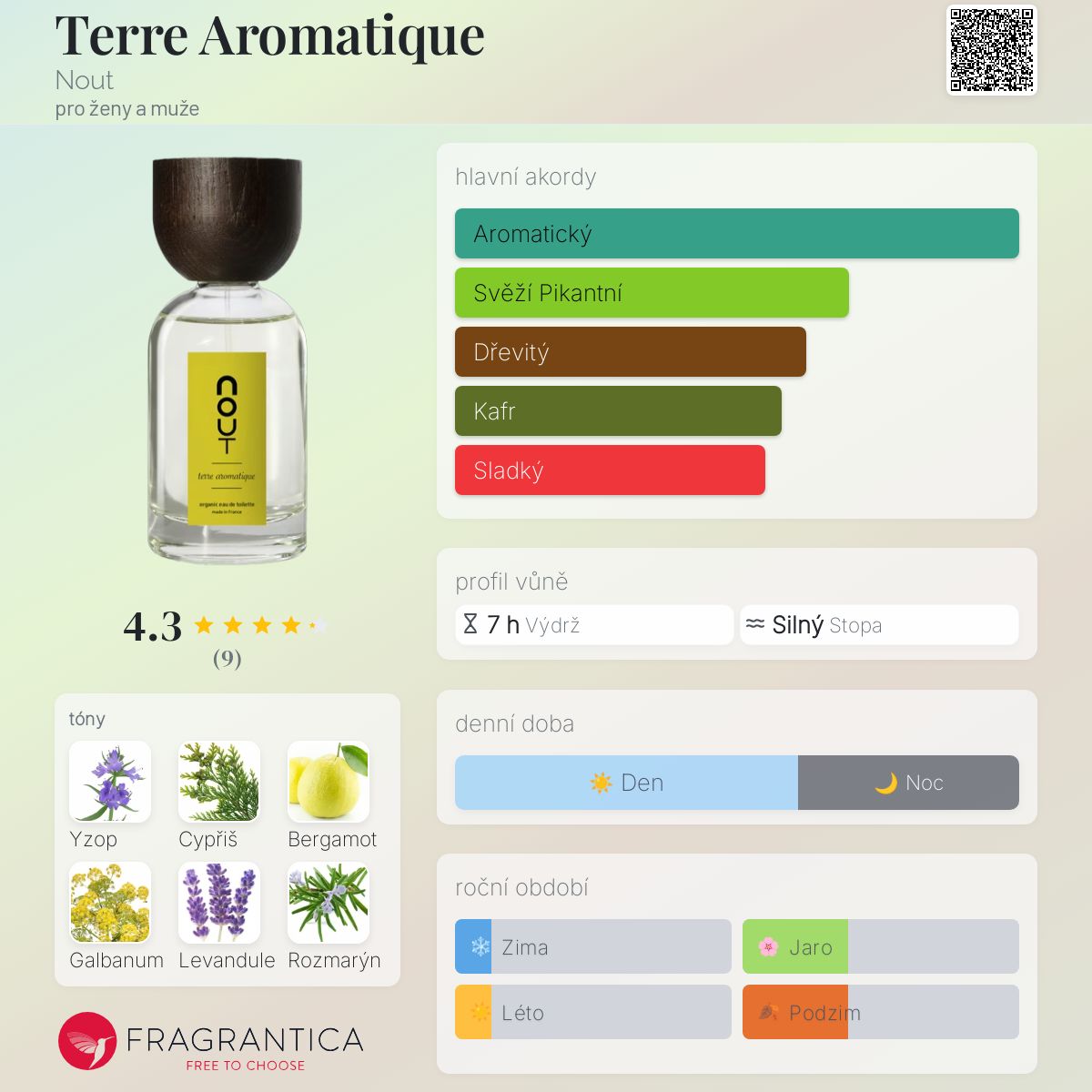 Terre Aromatique podle Nout je vůně pro ženy a muže. Terre Aromatique byl/a uveden/a v roce 2021. "Nosem" za touto vůní je Laure-Leta Jacquet. Vrchní tóny jsou Yzop, Cypřiš, Bergamot a Íránské galbanum; střední tóny jsouLevandule, Pelargónie, Muškátový oříšek a Skořice ; základní tóny jsou Rozmarýn, Virginský cedr, Fazole tonka a Mýdlo.